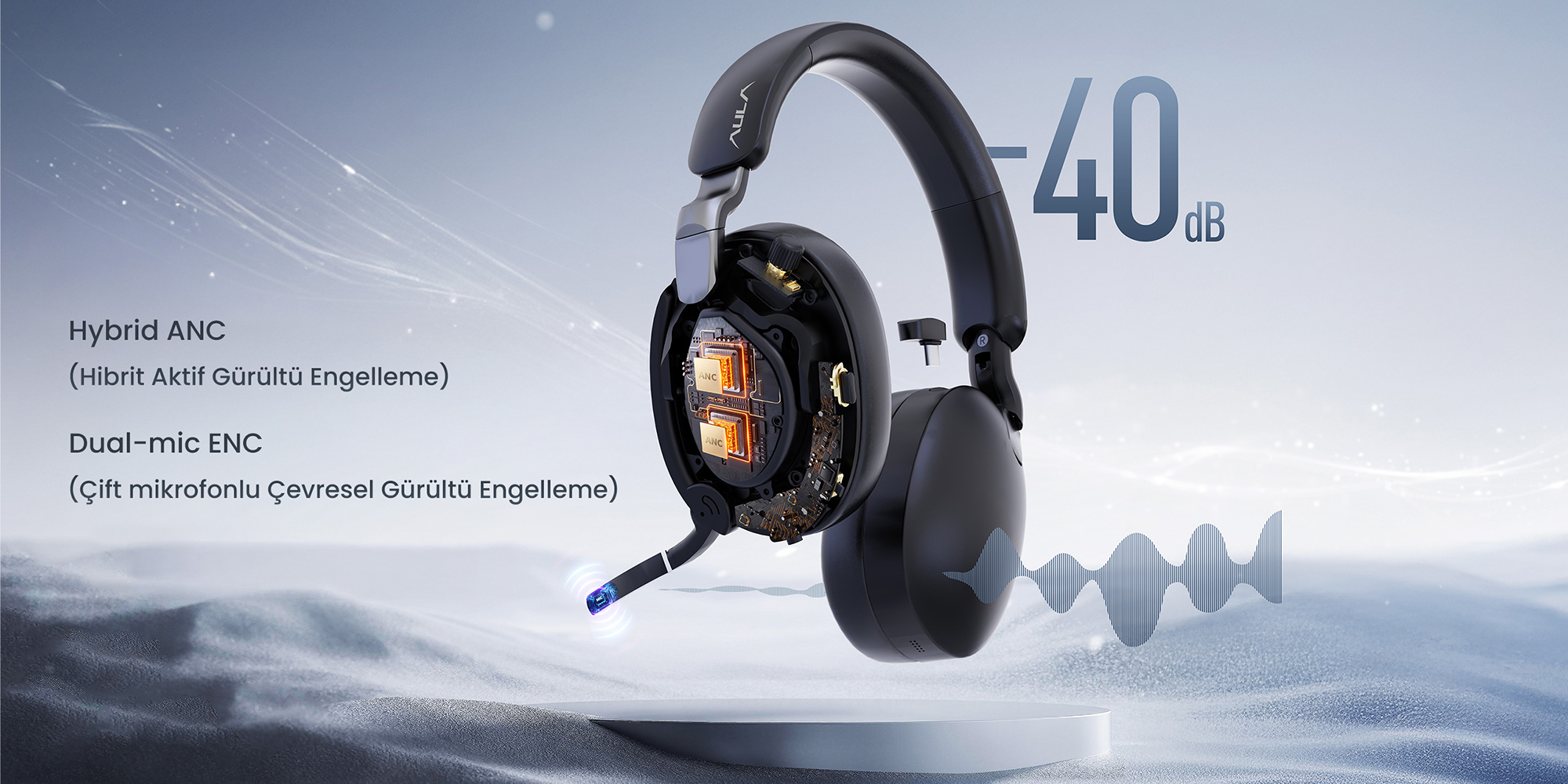 AULA A500 Hybrid ANC Kablosuz Bluetooth 5.4 Kulak Üstü Kulaklık, gelişmiş teknolojisi ve ergonomik tasarımıyla fark yaratıyor. Hibrit aktif gürültü engelleme (ANC) özelliği, Bluetooth 5.4 ve 2.4G çift bağlantı desteği, uzun pil ömrü ve yüksek mikrofon performansıyla hem profesyonel kullanımlar hem de günlük müzik keyfi için ideal bir seçim sunar.