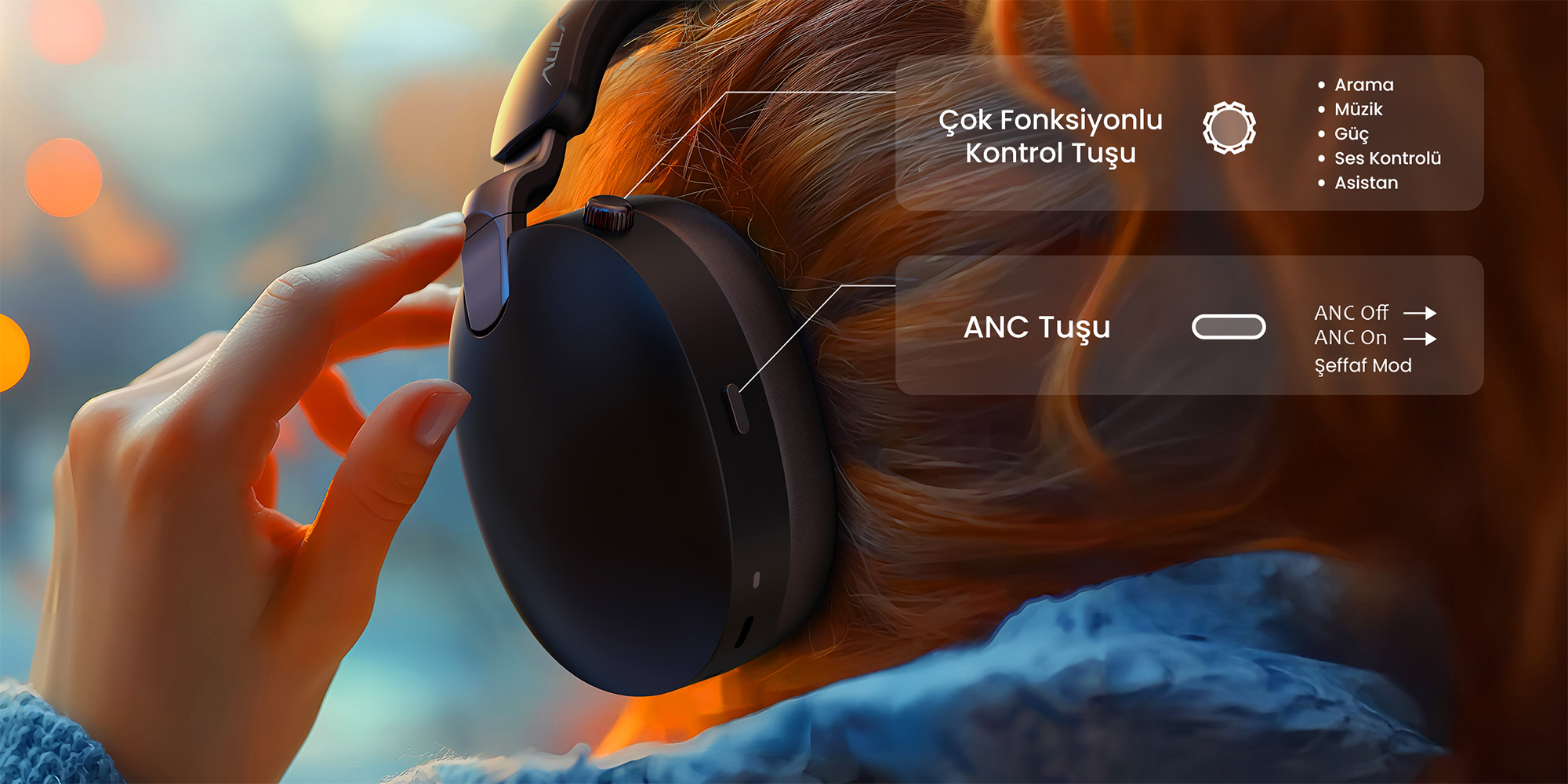 Uzun süreli kullanımlar için özel olarak tasarlanan AULA A500, 90° dönebilen kulak kapakları ve ayarlanabilir baş bandı ile konforlu bir kullanım sunar. Üzerindeki çok fonksiyonlu MFB ve ANC tuşları sayesinde ses seviyesi ayarı, şarkı geçişi, arama yanıtlama ve sesli asistan etkinleştirme işlemleri kolayca yapılabilir.