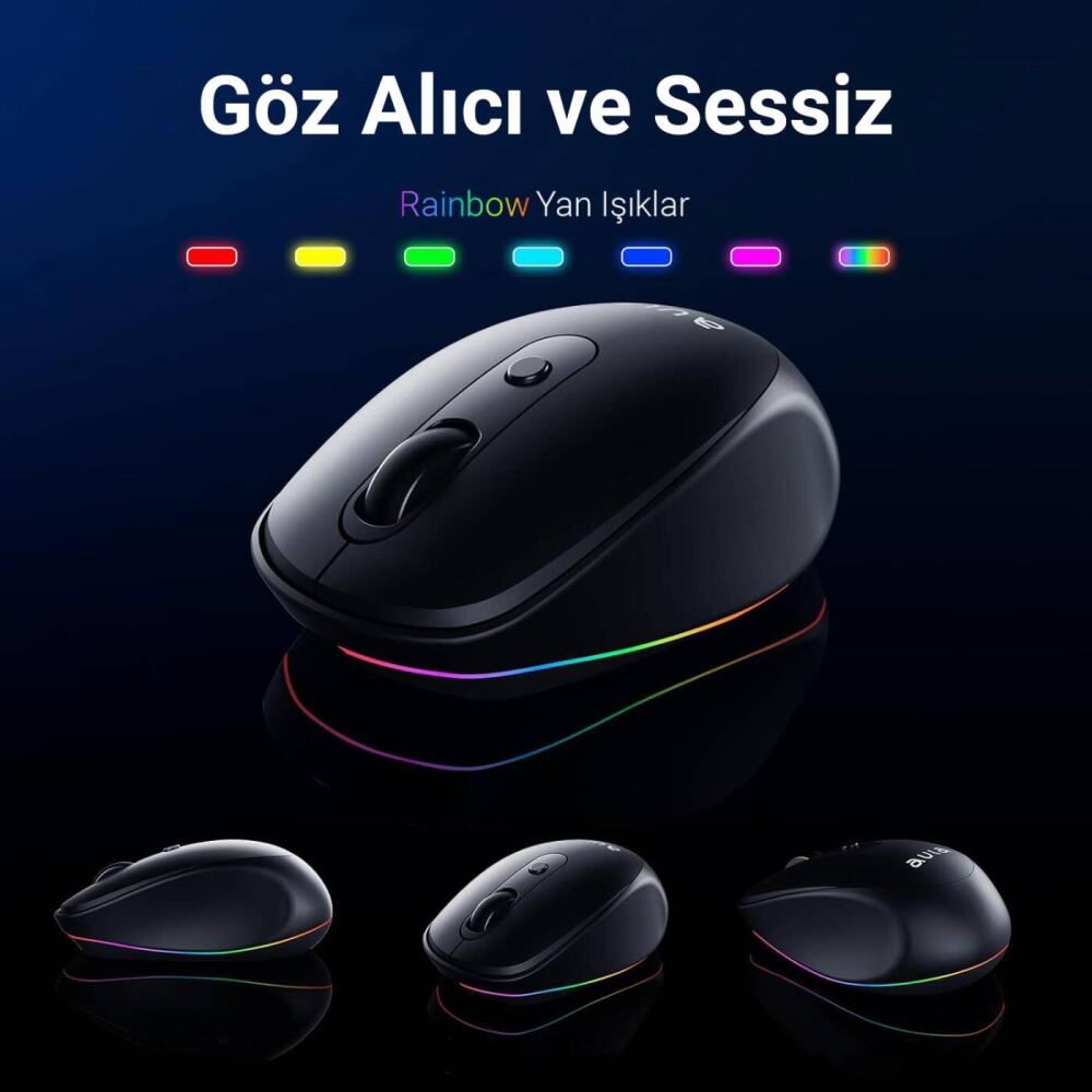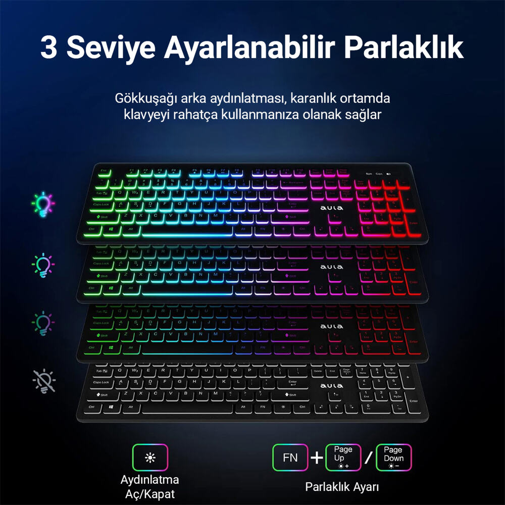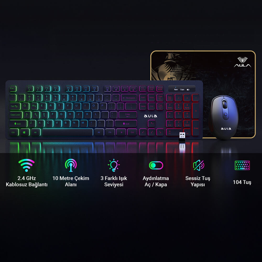 Aula AC208 Rainbow 2.4GHz Kablosuz Şarjlı Türkçe Q Klavye / Mouse ve Mousepad Seti, setin içinde bulunan mousepad örgü kenar işlemeleri, kumaş yüzeyi ve kauçuk tabanı ile çok uzun ömürlüdür. Kauçuk tabanı sayesinde yerleştirdiğiniz yerden kaymaz. Mousepad'in Control yüzeye sahip oluşu mouse ile yaptığınız hareketlerin keskinliğini arttırır. Rainbow efekti rekabetçi oyunlarda dikkatinizi dağıtıyorsa FN tuşunun yanında bulunan Rainbow kontrol tuşu ile ışığı kapatıp açabilirsiniz veya FN + Page Up / Down tuş kombinasyonu ile ışık parlaklığını ayarlayabilirsiniz. Özel tuş tasarımı ile klavye su sıçramalarına karşı dayanıklıdır. Multimedyaya sahip olan klavye FN + F1 / F12 tuş kombinasyonu ile işlemlerinizi daha hızlı gerçekleştirmenize yardımcı olur. 800 / 1200 / 1600 DPI olacak şekilde 3 farklı hassasiyet seçeneği sunan mouse set içinde bulunan klavye ile uyum sağlayacak şekilde Rainbow aydınlatmaya sahiptir. Mouse sahip olduğu optik sensör ile hareketlerinizi bilgisayarınıza yüksek doğruluk ile aktarır. Mouse ve klavyenizi set ile birlikte gelen Type-C kablo ile kısa sürede şarj edebilirsiniz. Mouse ve klavye ultra sessiz çalışır böylece odağınız bozulmaz. Enerj tasarrufu için klavye 2 dakika mouse ise 1,5 dakika içinde uyku moduna geçerek daha uzun kullanım süreleri sağlar. Tek bir dongle ile ortak şekilde çalışan klavye ve mouse yaklaşık 10 metreye kadar çekim alanına sahiptir. ABS materyalde tasarlanan dış kasaları oluşabilecek olumsuz durumlara karşı dayanıklıdır.