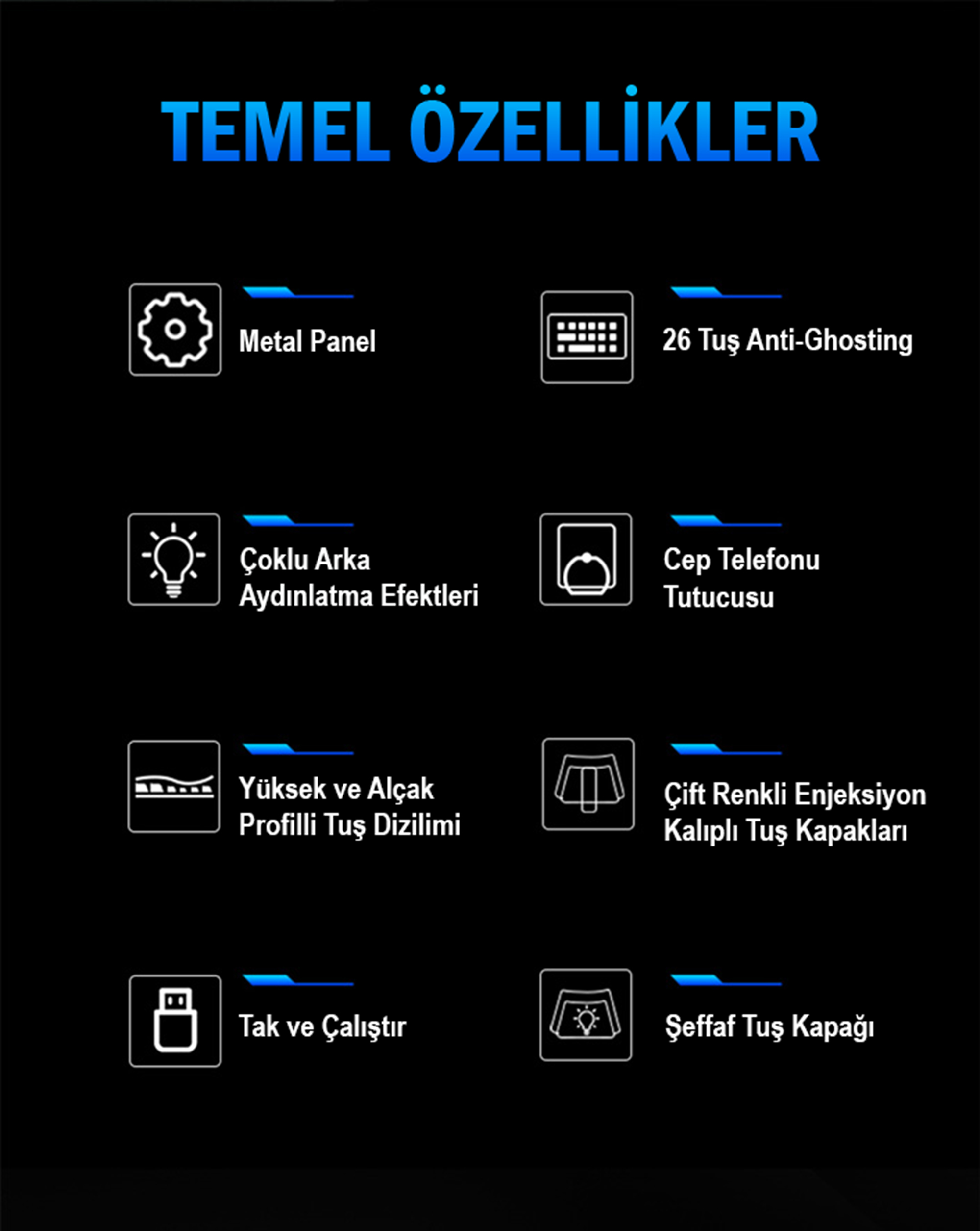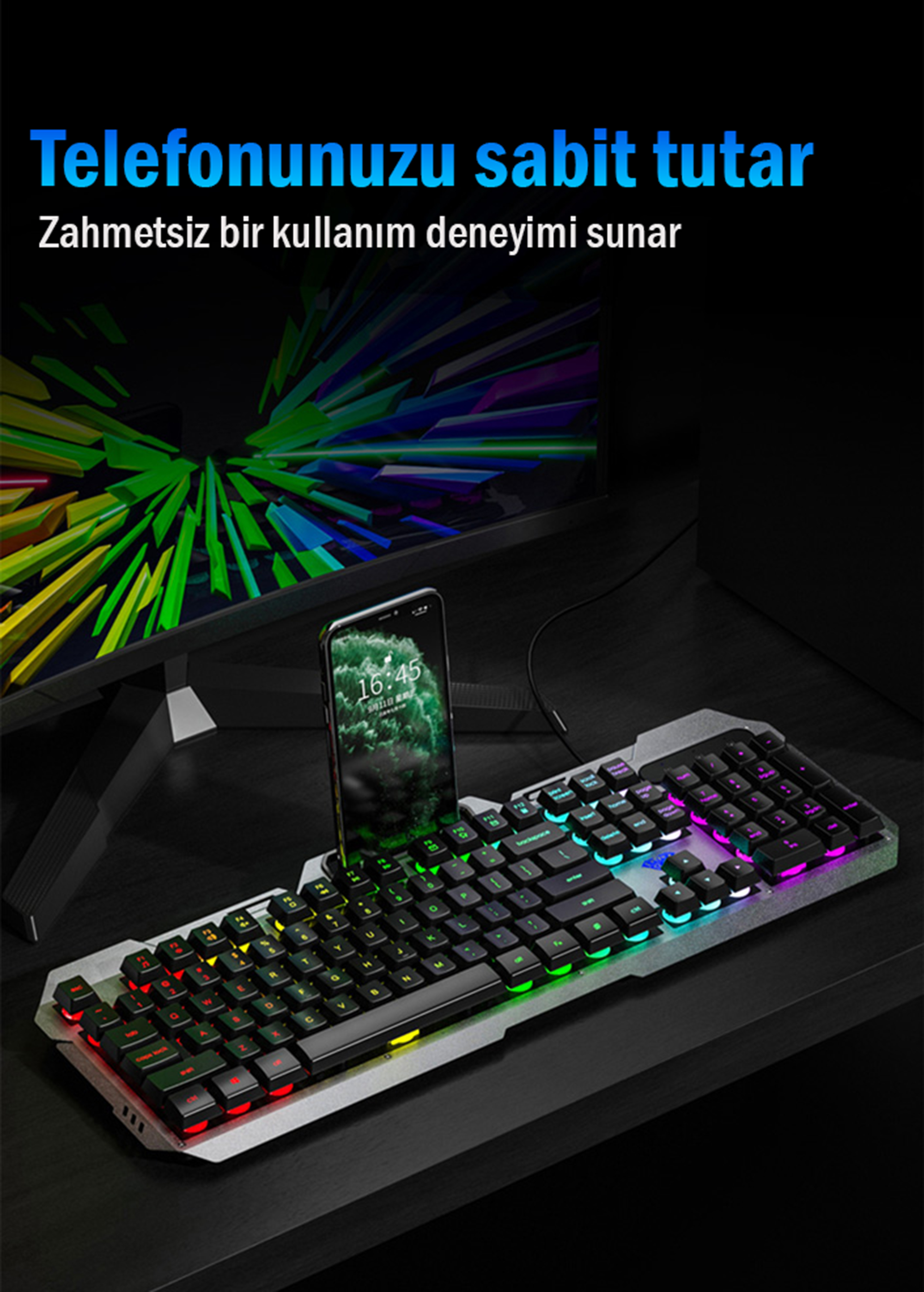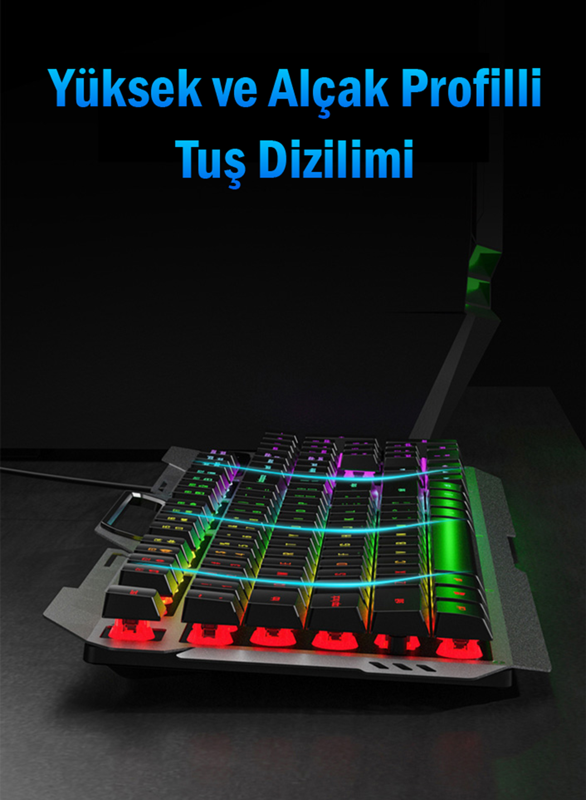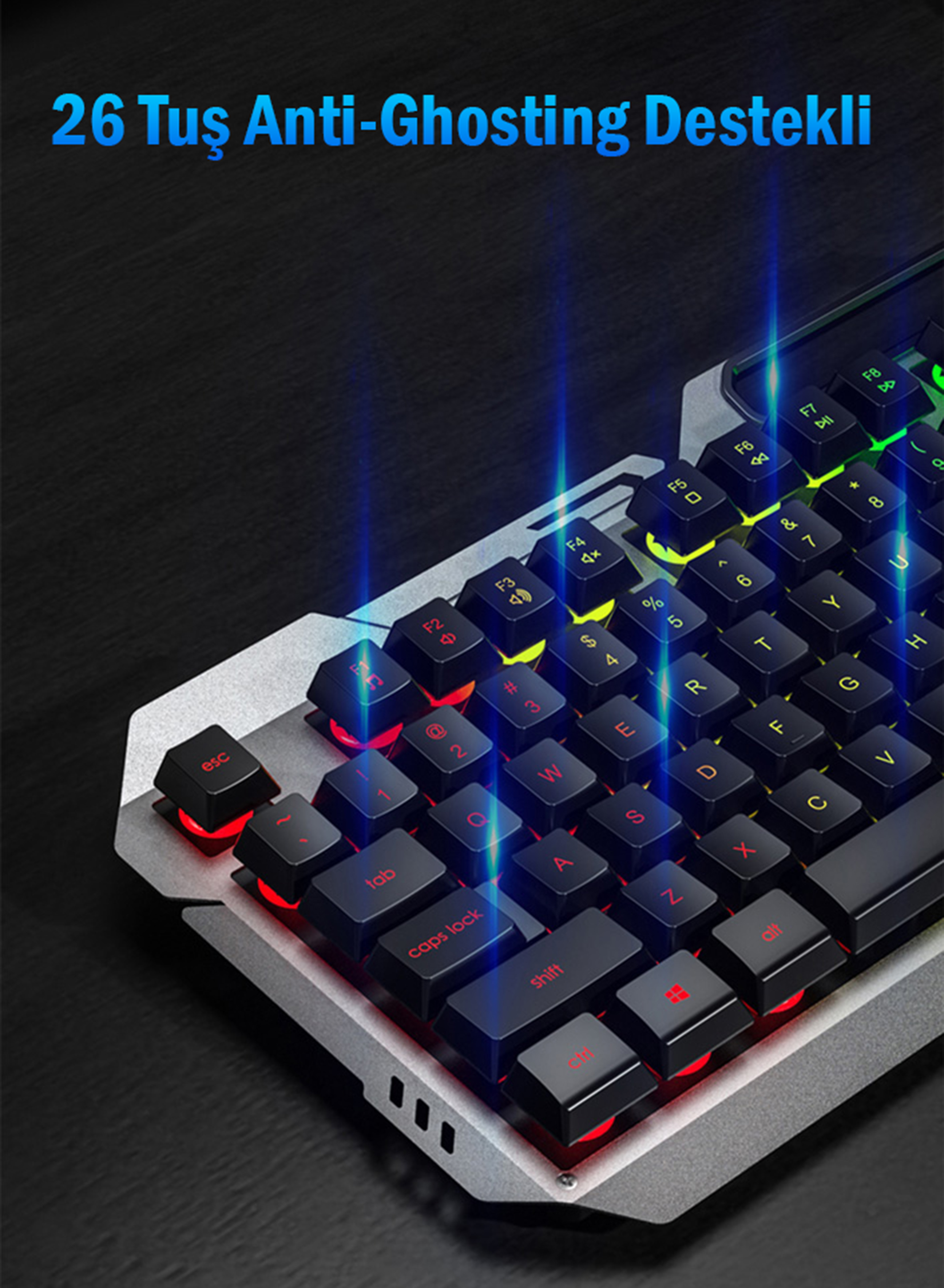 Aydınlatmalı rainbow klavye ve RGB nefes efektli mouse ile oyun alanınızı özelleştirin. Klavye üzerinde aydınlatma efektlerini, parlaklık seviyesini ve geçiş hızını kolayca ayarlayarak atmosferi tamamen size özel hale getirin. 26 tuş anti-ghosting teknolojisiyle desteklenen sistem, hem görsel olarak etkileyici bir deneyim hem de hatasız bir tuşlama sağlar.