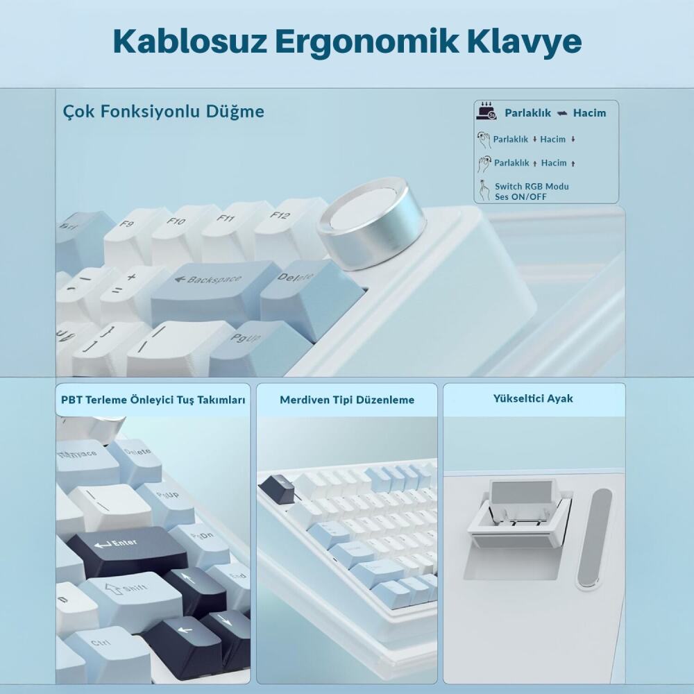 Aula F75 Mekanik RGB TKL Hot Swap GrayWood V4 Switch Kablosuz Makrolu Türkçe Q Klavye Buz Mavisi