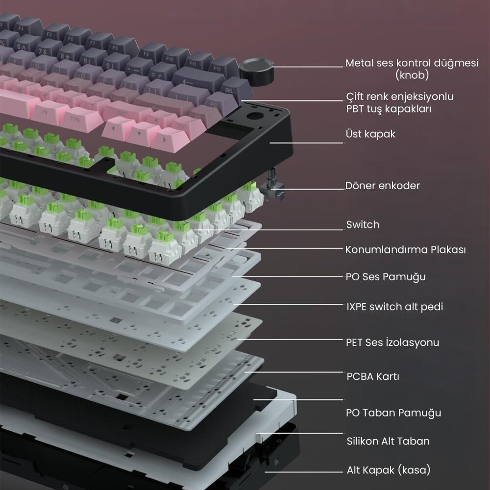 Bu mekanik klavye, dayanıklılığı artıran beş kat dolgu susturucusu, PCB ve konumlandırma plakası ile güçlendirilmiş bir yapıya sahiptir. Genişletilmiş entegre silikon ped ve PCB tuş yuvası, yazma deneyimini yumuşak ve esnek hale getirir. Şaft boşluğu ve konumlandırma plakası arasındaki boşlukları dolduran yapı, mekanik tuş sesini minimize eder ve sağlam bir his sağlar.