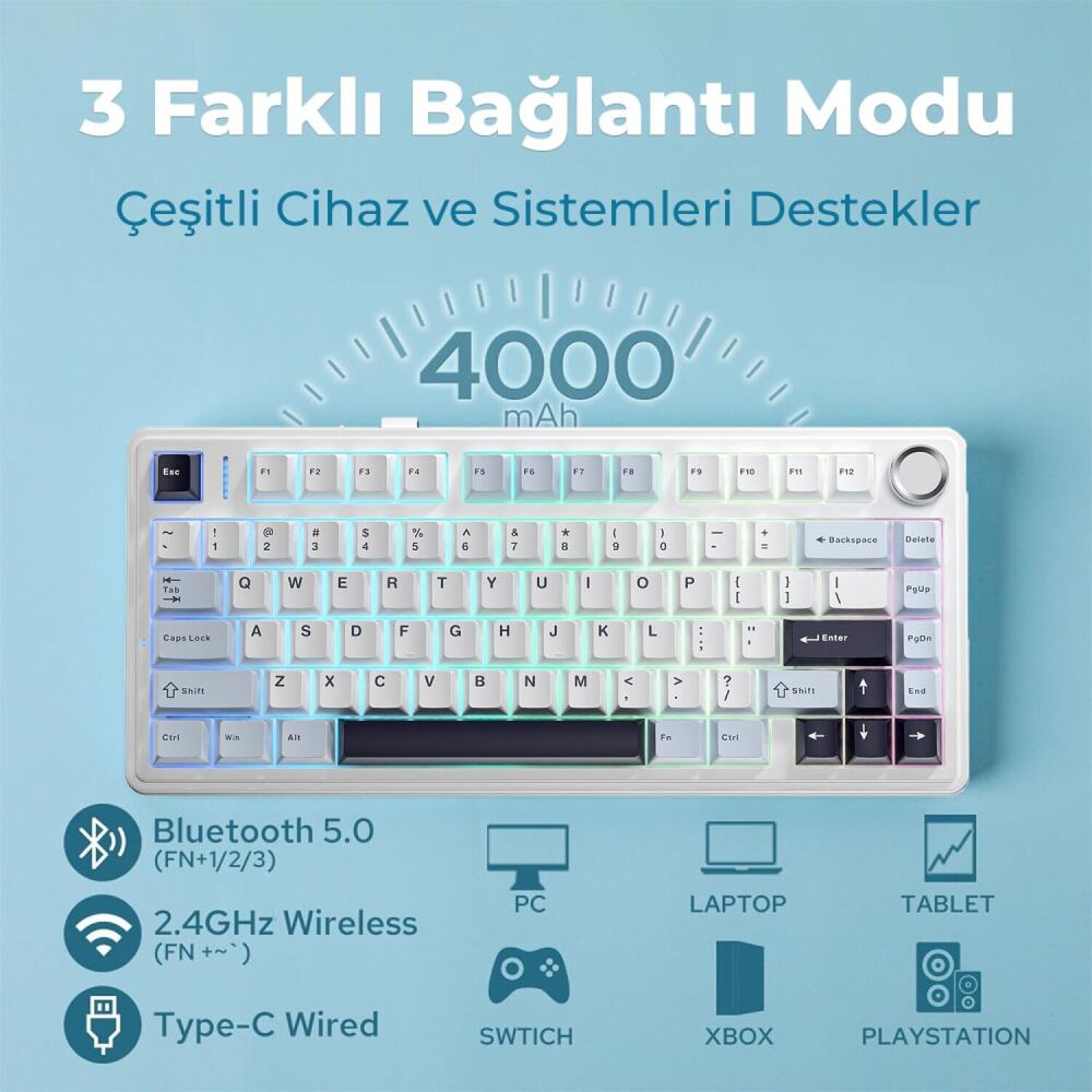 Type-C, Bluetooth ve kablolu olmak üzere üç farklı bağlantı seçeneği ile size kullanım esnekliği sağlar. Aynı anda üç farklı cihaza bağlanabilme ve bu cihazlar arasında kolayca geçiş yapabilme özelliği, çoklu görevler için idealdir. Bluetooth bağlantısında klavyeyi 3 farklı cihazla eşleştirebilirsiniz. Bluetooth ile eşleştirdiğiniz cihazlar arasında FN + 1 / 2 / 3 tuş kombinasyonları ile geçiş yapabilirsiniz. Ultra düşük gecikme süresi ile kablosuz bağlantı sağladığınızda F75'i gecikme ve kesinti olmadan sorunsuz bir şekilde kullanabilirsiniz, böylece oyun ve çalışma deneyimi daha akıcı hale gelir.