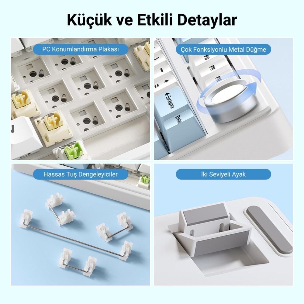 Klavyenin iç yapısında bulunan PO ses pamuğu, IXPE izolasyon, PET ses izolasyonu ve PO alt ses pamuğu, üstün ses yalıtımı ve yazma konforu sağlar. Kasa içi silikon alt taban ise ekstra stabilite ve dayanıklılık kazandırır.