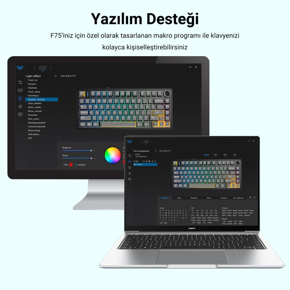 Aula F75 Mekanik RGB TKL Reaper Switch Kablosuz Makrolu Hot Swap Klavye Pastel, kullanıcılara üstün performans ve özel bir deneyim sunmak için tasarlanmıştır. Klavyede kullanılan yüksek kaliteli malzemeler F75'in uzun ömürlü bir kullanımın yanında kendine has özel bir sese sahip olmasını sağlar. Klavye, Windows, Mac, Android ve iOS işletim sistemleriyle tamamen uyumludur, bu da onu çok yönlü bir cihaz yapar. Kablolu bağlantı yaptığınızda F75'in yazılımı ile tuş atamaları, RGB kontrolleri, uyku süresi gibi bir çok ayarı profil oluşturmak, makro yazmak gibi özellikleri kontrol edebilir kullanabilirsiniz. Alt kısımda bulunan kaymaz silikon pedler klavyenizin yer değiştirmesini engeller. Yine alt kısımda bulunan iki kademeli ayaklar ile kendinize en uygun yüksekliği bulabilirsiniz. Fn tuşunu kullanarak hızlı başlangıç kılavuzu ve kullanım kılavuzunda görebileceğiniz gibi ışıklandırma kontrolleri, ses kontrolleri, multimedya kontrolleri ve işletim sistemi değiştirme gibi işlemleri hızlıca yapabilirsiniz.