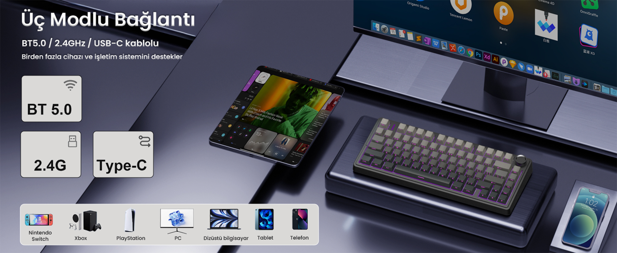 - Bluetooth Modu (BLE5.0/BLE3.0): Üç cihazla eşzamanlı bağlantı. FN+1, FN+2, FN+3 ile cihazlar arasında geçiş.
