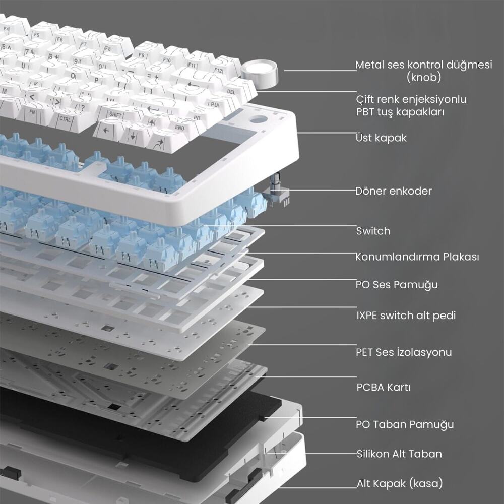 Bu mekanik klavye, dayanıklılığı artıran beş kat dolgu susturucusu, PCB ve konumlandırma plakası ile güçlendirilmiş bir yapıya sahiptir. Genişletilmiş entegre silikon ped ve PCB tuş yuvası, yazma deneyimini yumuşak ve esnek hale getirir. Şaft boşluğu ve konumlandırma plakası arasındaki boşlukları dolduran yapı, mekanik tuş sesini minimize eder ve sağlam bir his sağlar.