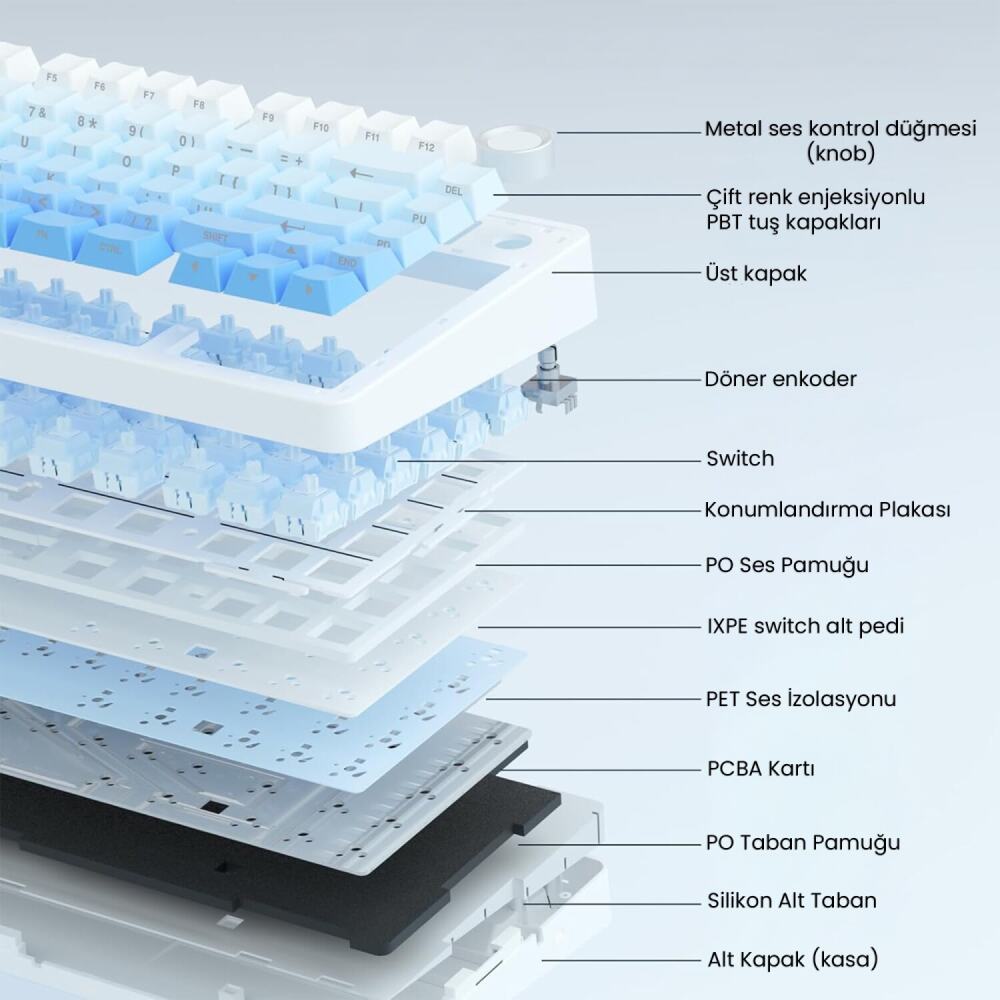 Bu mekanik klavye, dayanıklılığı artıran beş kat dolgu susturucusu, PCB ve konumlandırma plakası ile güçlendirilmiş bir yapıya sahiptir. Genişletilmiş entegre silikon ped ve PCB tuş yuvası, yazma deneyimini yumuşak ve esnek hale getirir. Şaft boşluğu ve konumlandırma plakası arasındaki boşlukları dolduran yapı, mekanik tuş sesini minimize eder ve sağlam bir his sağlar.