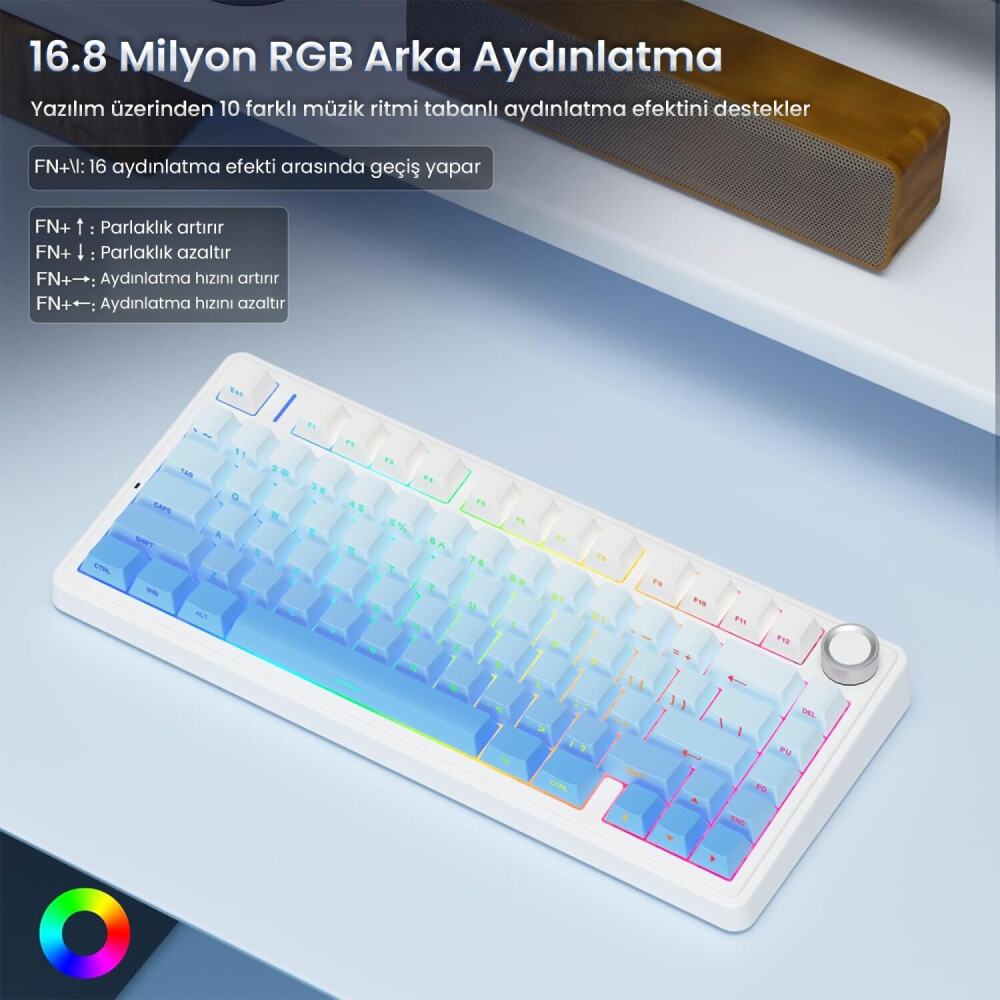F75 Pro, 16,8 milyon renkli RGB arka aydınlatma ile donatılmıştır. 16 önceden ayarlanmış aydınlatma efekti sayesinde oyunlarınıza eşsiz bir atmosfer katar. Sürücü yazılımı ile 10 müzik ritmi tabanlı aydınlatma efekti kullanılabilir. FN tuş kombinasyonları veya yan düğme ile aydınlatma parlaklığı ve hızını kolayca ayarlayabilirsiniz. Arka ışık ihtiyaca göre tamamen kapatılabilir.