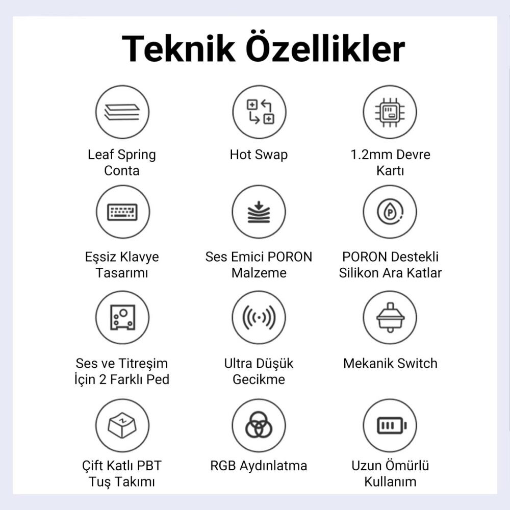Klavye, leaf spring conta ile kullanım deneyiminizi daha konforlu hale getirir. İki renkli PBT tuş kapakları, aşınmaya karşı dayanıklıdır ve uzun süreli kullanımlarda bile renk kaybı yaşanmaz. Boşluk (Space Bar) gibi uzun tuşlar, klavye içindeki yağlanmış dengeleyicilerle düzgün bir basış sağlar ve tuş takılmalarını engeller. Klavyenin iç yapısında bulunan PO ses pamuğu, IXPE izolasyon, PET ses izolasyonu ve PO alt ses pamuğu, üstün ses yalıtımı ve yazma konforu sağlar. Kasa içi silikon alt taban ise ekstra stabilite ve dayanıklılık kazandırır.