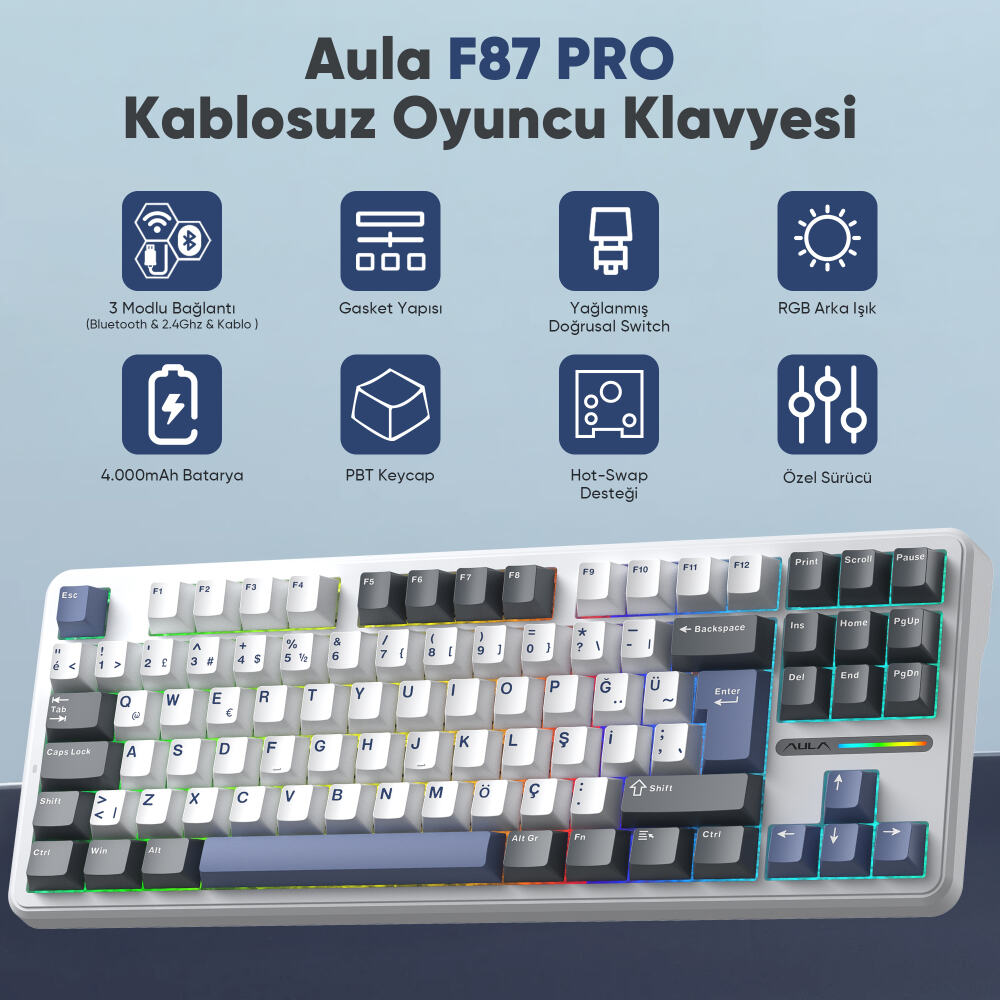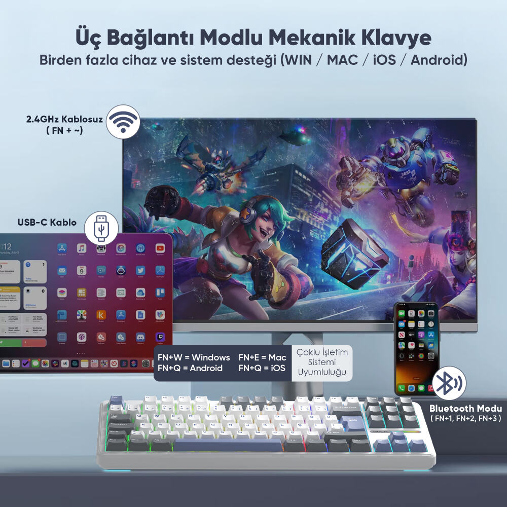 Sıkça Sorulan Sorulan Bu Mekanik Oyuncu Klavyesi Hangi Cihazlarla Uyumludur?F87 Pro aula klavye, Windows, MacOS, Android ve iOS işletim sistemleriyle tam uyumludur. Bluetooth ve 2.4 GHz kablosuz bağlantı seçenekleri sayesinde bilgisayar, tablet ve akıllı telefonlarınızda kullanabilirsiniz. Type-C kablolu bağlantı ise kablolu kullanım tercih edenler için mevcuttur.