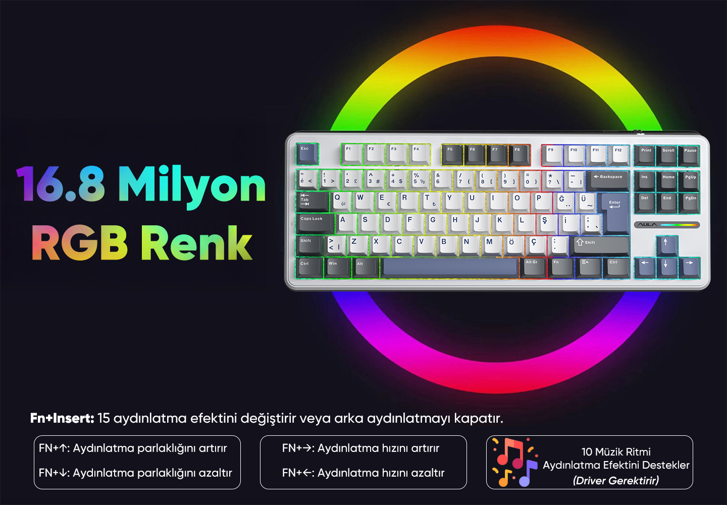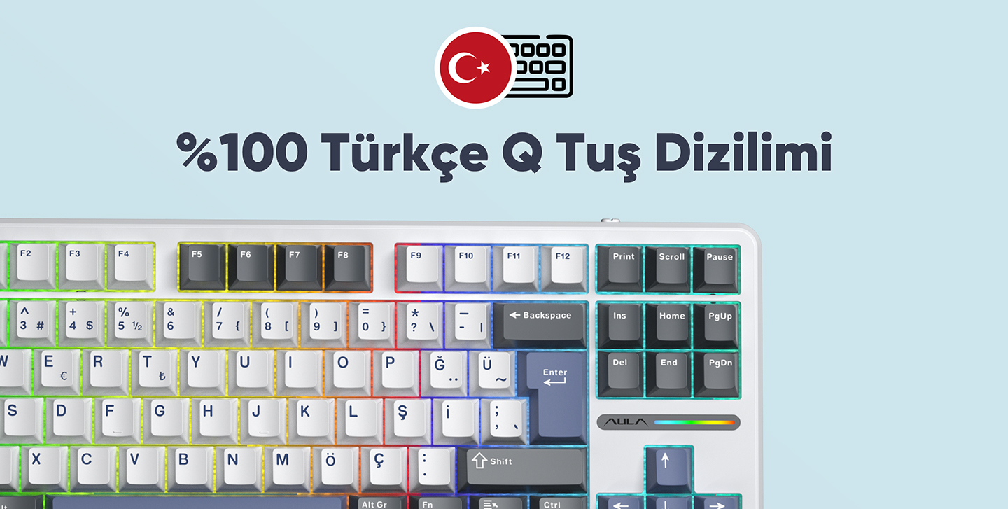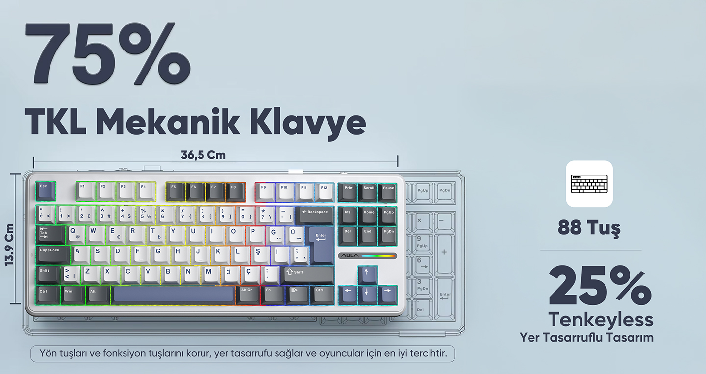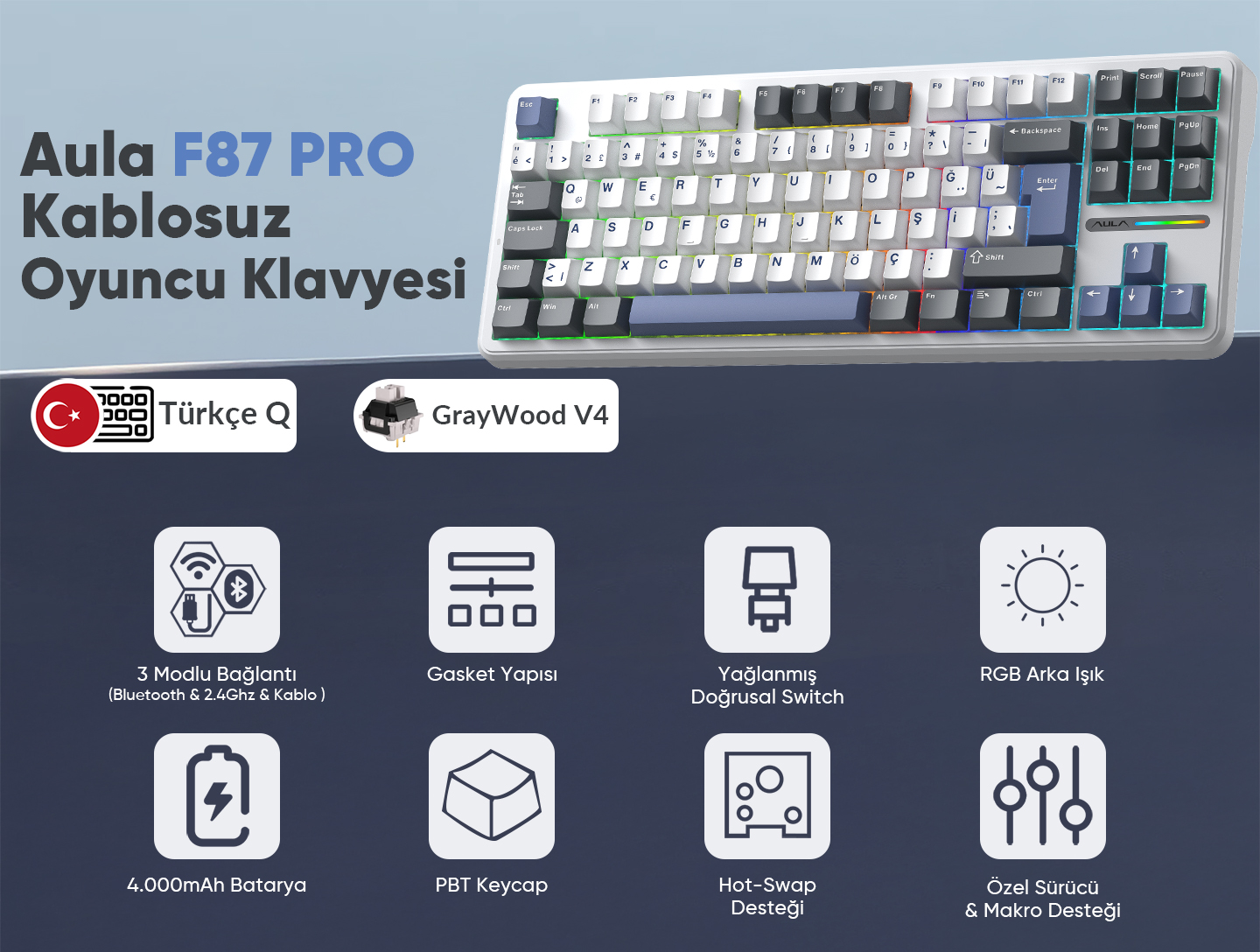 Aula F87 PRO Mekanik RGB TKL GrayWood V4 Switch Kablosuz Makrolu Hot Swap Türkçe Q Klavye Mavi
