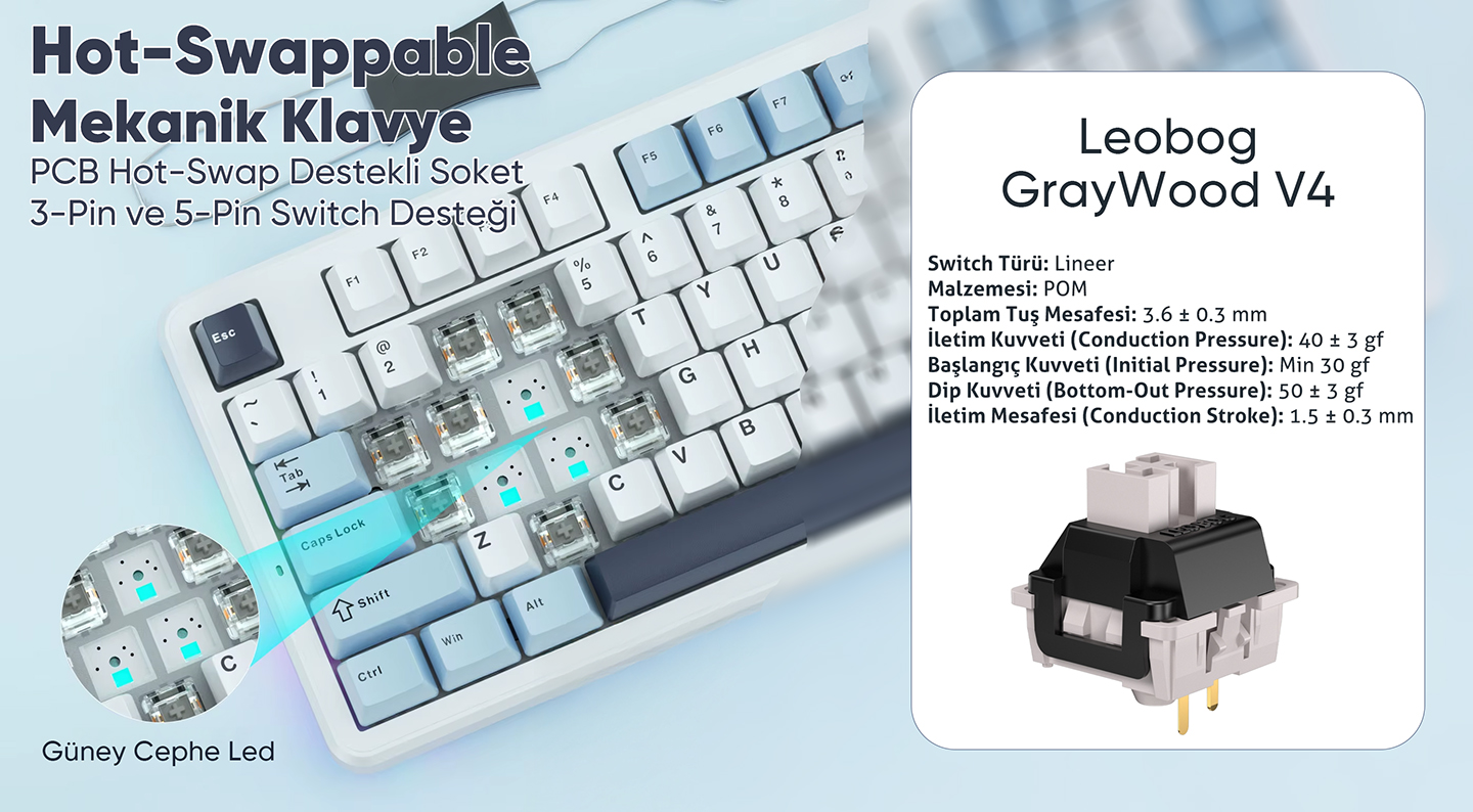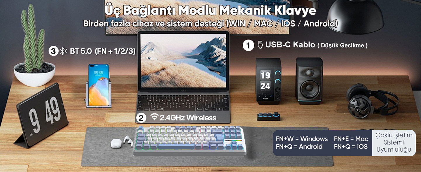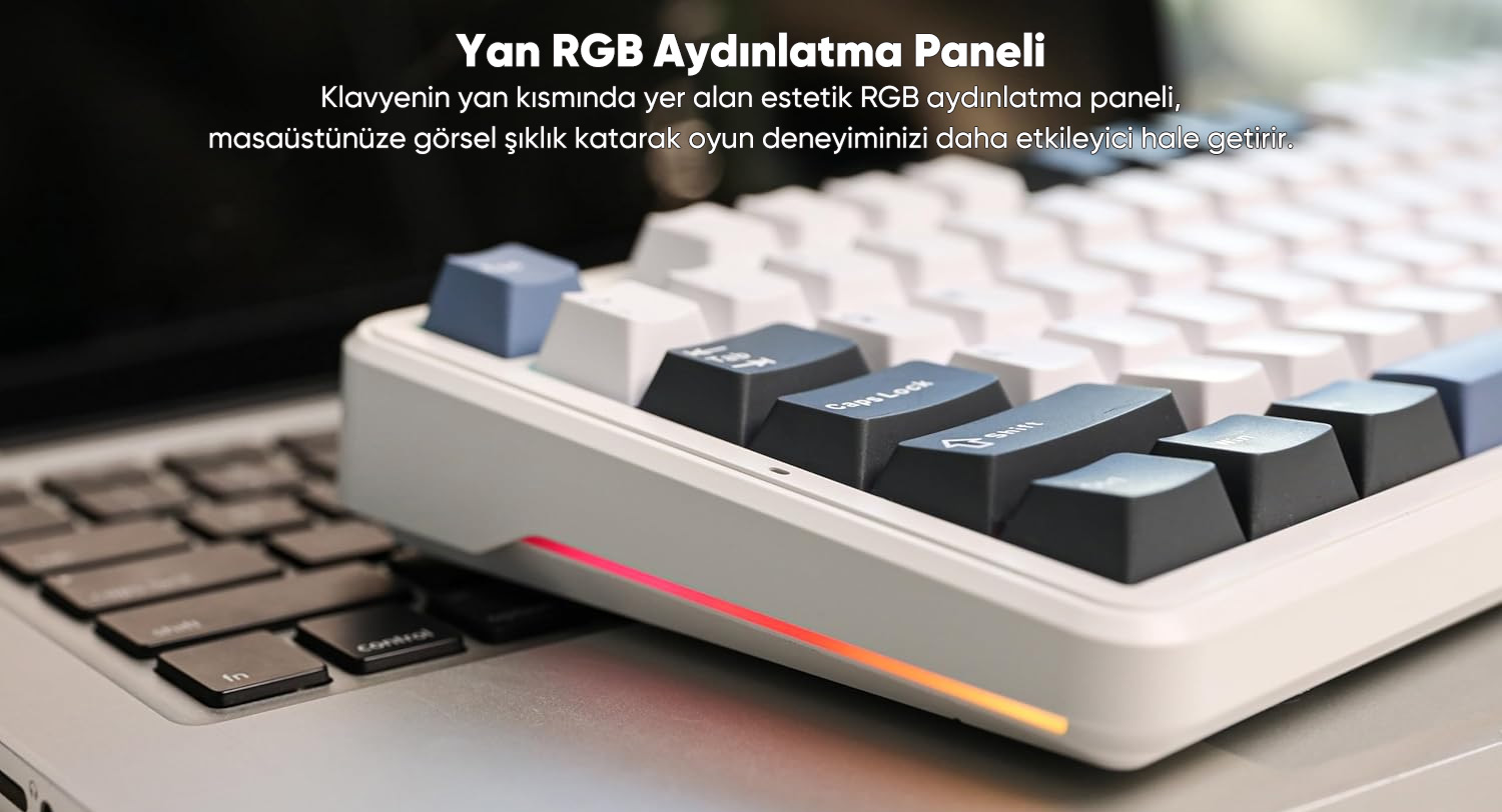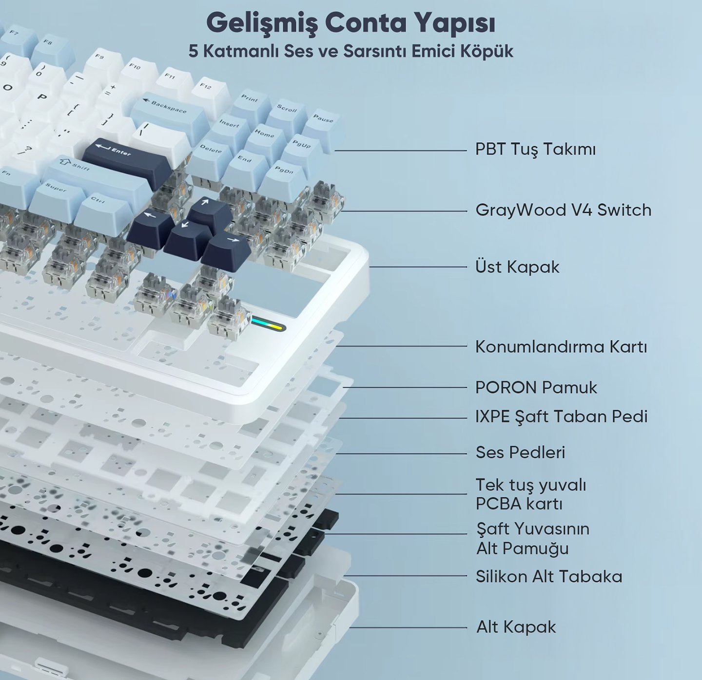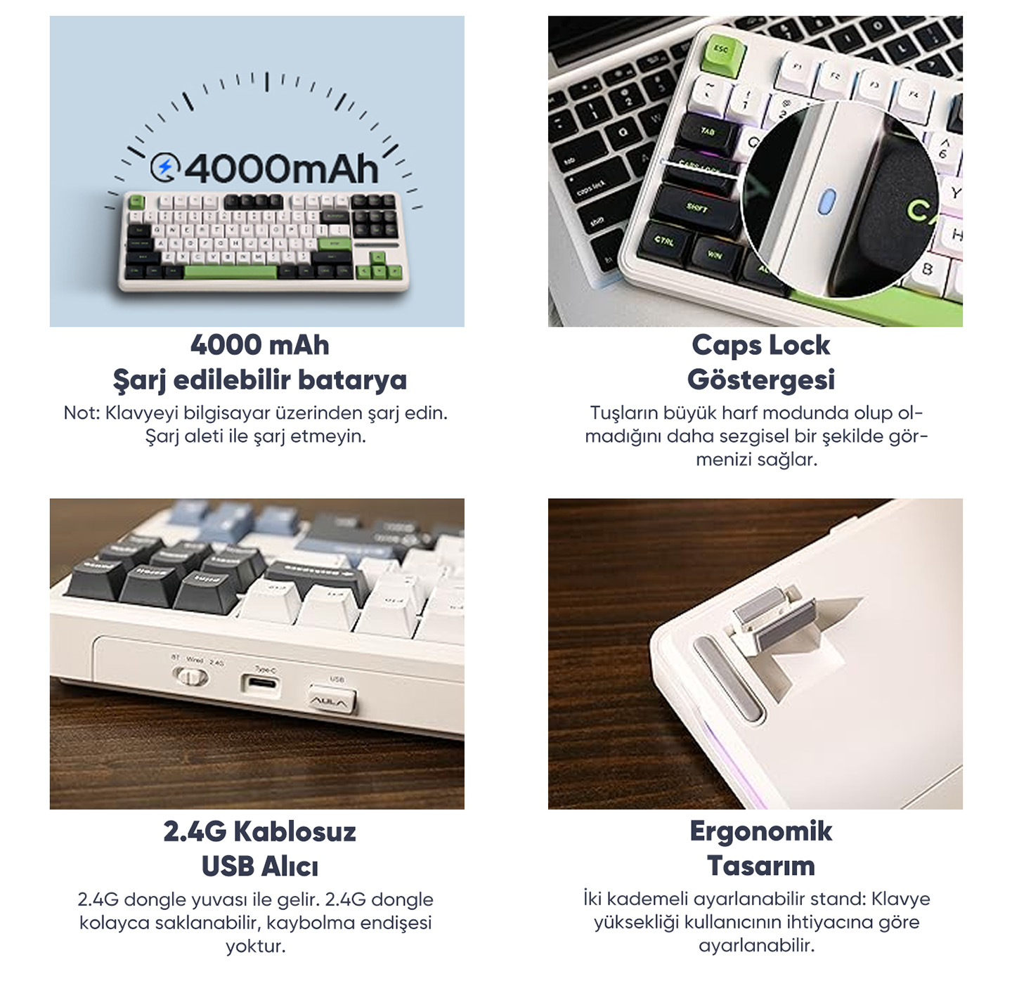 Aula F87 PRO Mekanik RGB TKL GrayWood V4 Switch Kablosuz Makrolu Hot Swap Türkçe Q Klavye Mavi