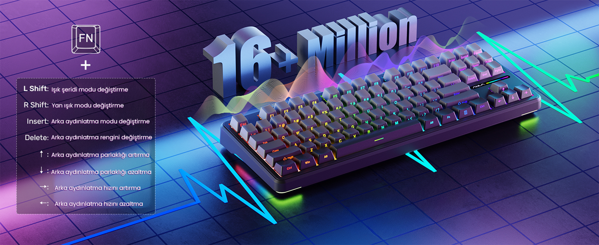 F87Pro, 16 farklı RGB ışık efektini destekler. FN+INS tuş kombinasyonu ile ışık efektlerini değiştirebilir, FN+B tuşu ile pil durumunu görüntüleyebilirsiniz. RGB Light Strip akıllı ve etkileyici bir görsellik sunar.