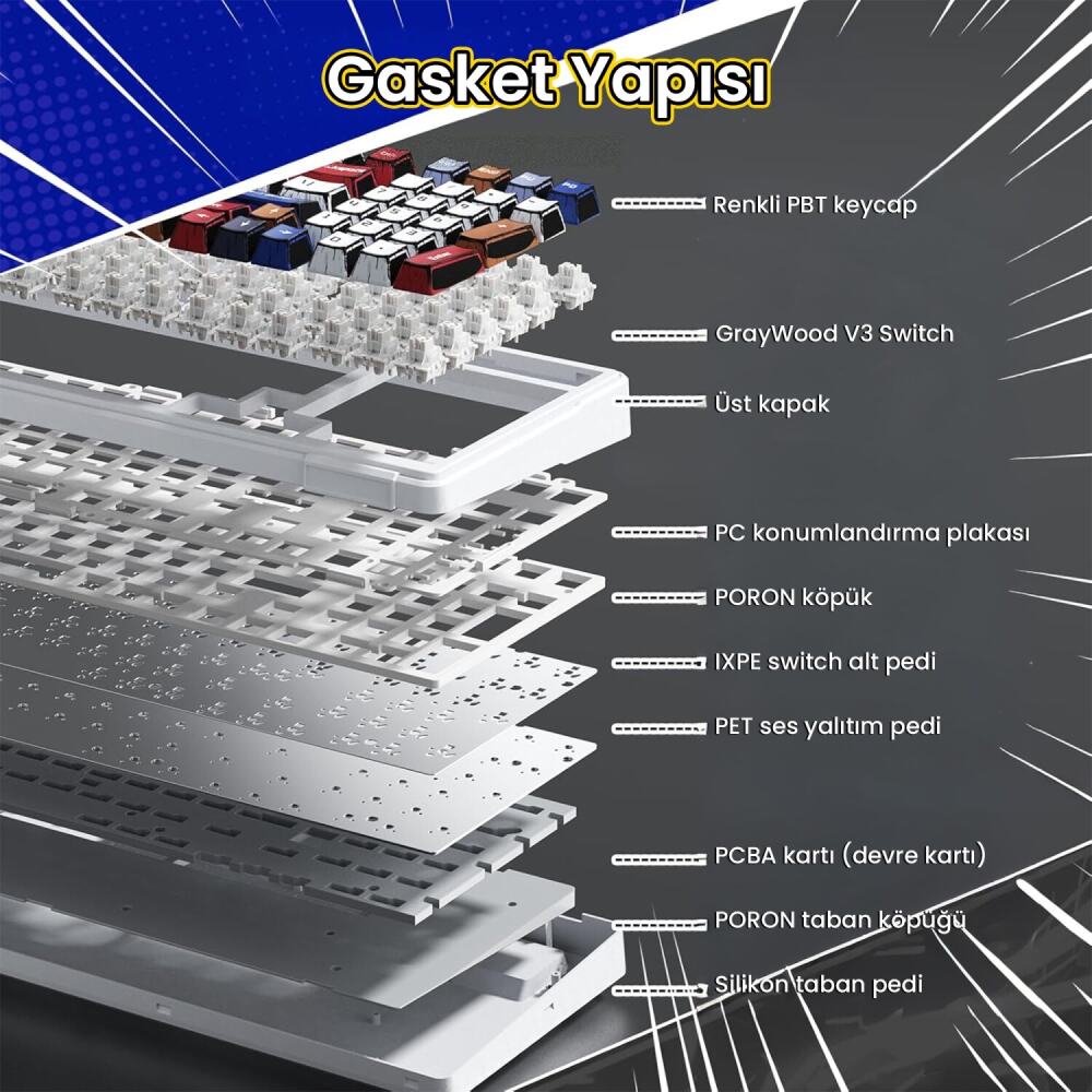 Sessiz bir yazma deneyimi için tasarlanan Reaper Switch’ler, tuşlara yumuşak bir basış hissi sunar. True soft elastik conta yapısı, PORON susturucu pamuk ve beş katmanlı dolgu susturucu ile tamamlanan iç yapı, ses yalıtımı ve yazma konforunu en üst düzeye çıkarır. 1.2 mm PCB slotlama ve ixpe şaft alt pedi sayesinde klavye, her yazma anında daha sessiz ve daha hassas bir performans sergiler. Anti-ghosting özelliği ile tuşlara aynı anda bassanız bile tüm işlemlerini algılayarak bilgisayarınıza aktarır.