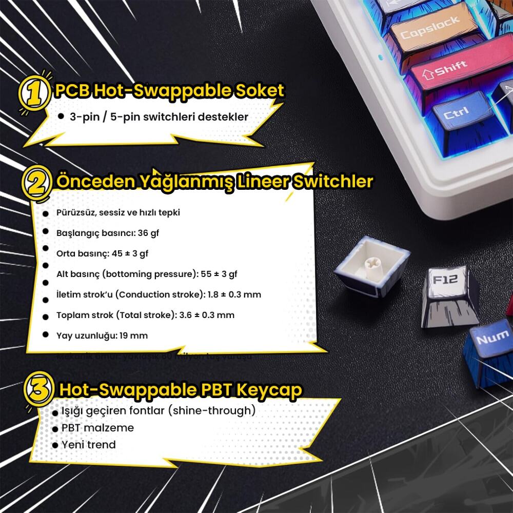 - 1 x Aula F99 3 Modlu RGB Hot Swap Mekanik Linear GrayWood V3 Switch Kablosuz Makrolu Klavye Comic