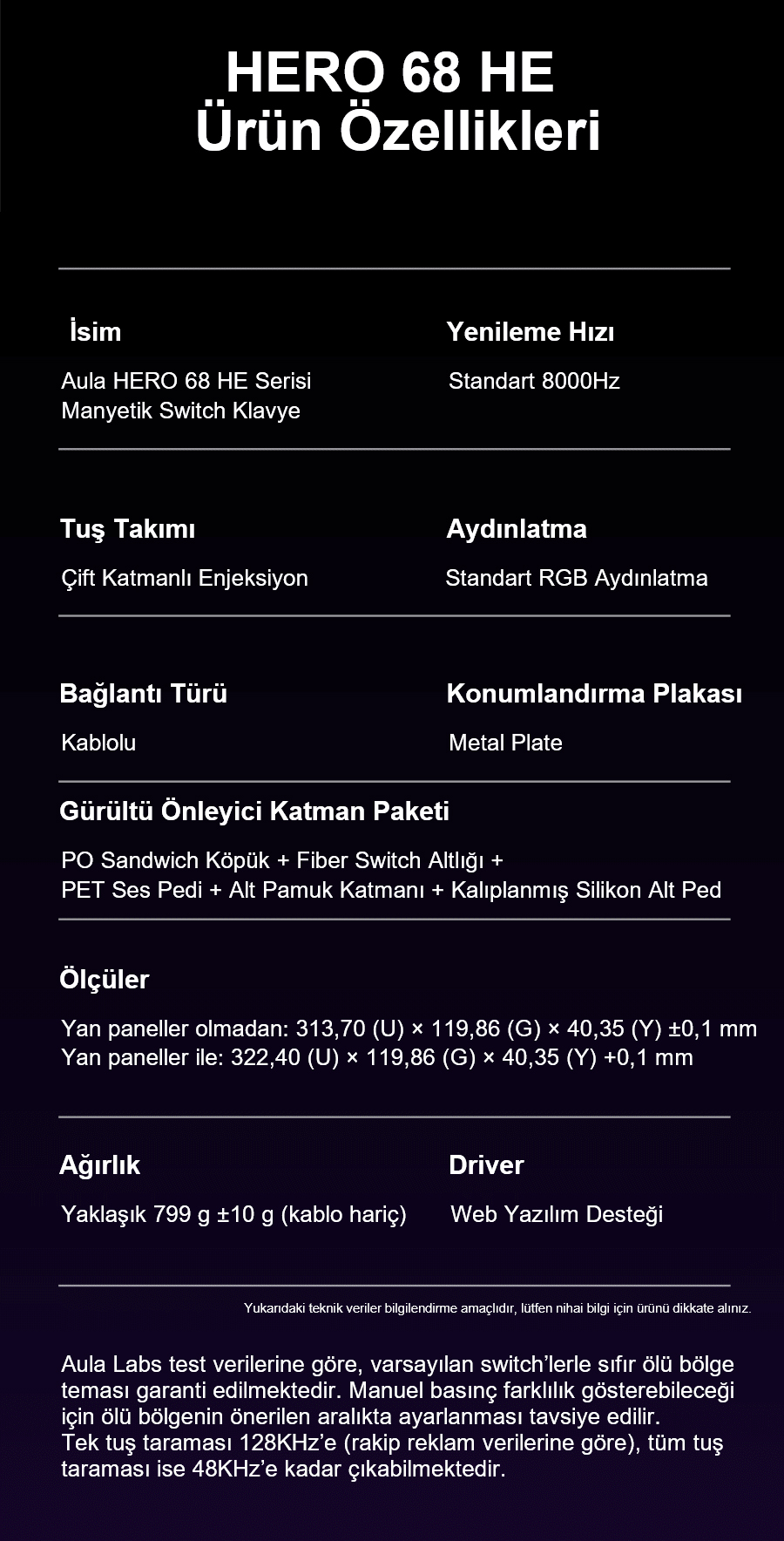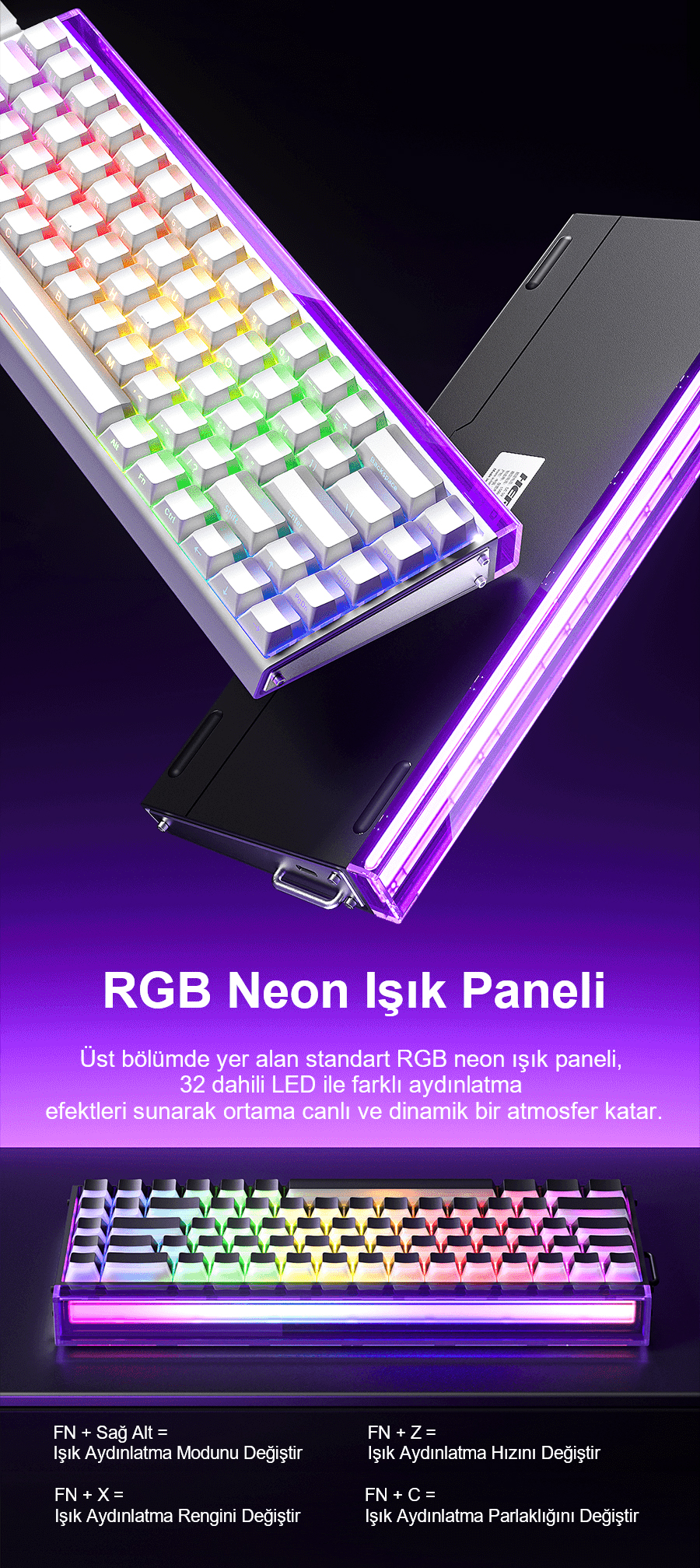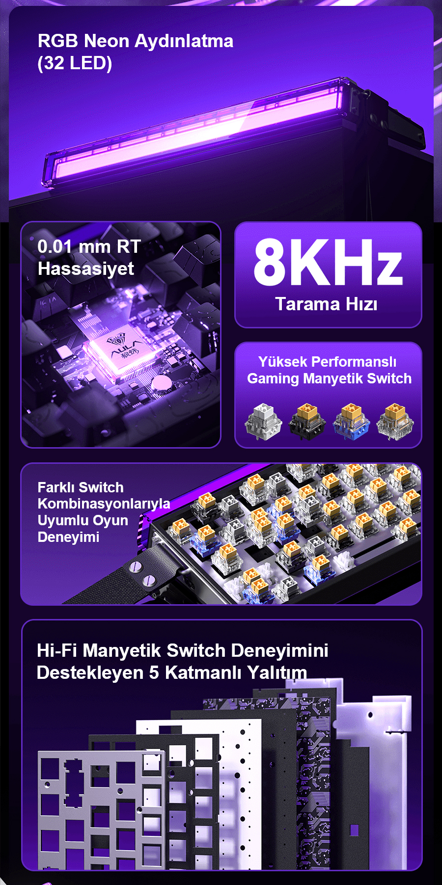 - Fonksiyonlar: RGB panel aydınlatma, Hot Swap, Makro Program Desteği, SOCD, Rapid Trigger, MPT, MT, DKS, TGL
