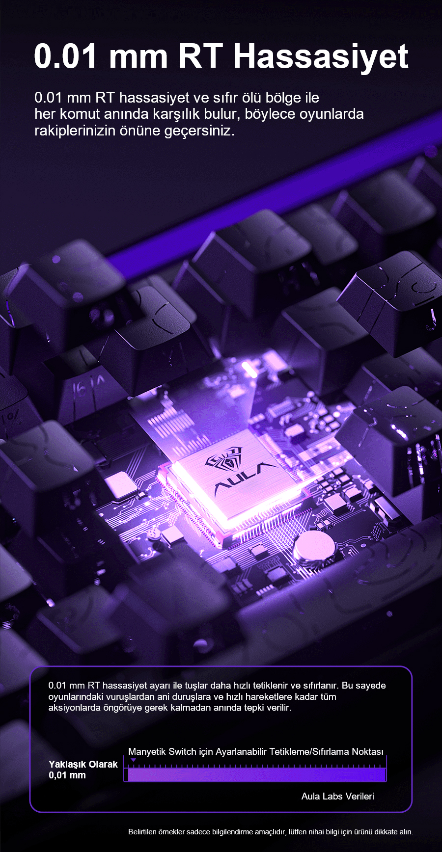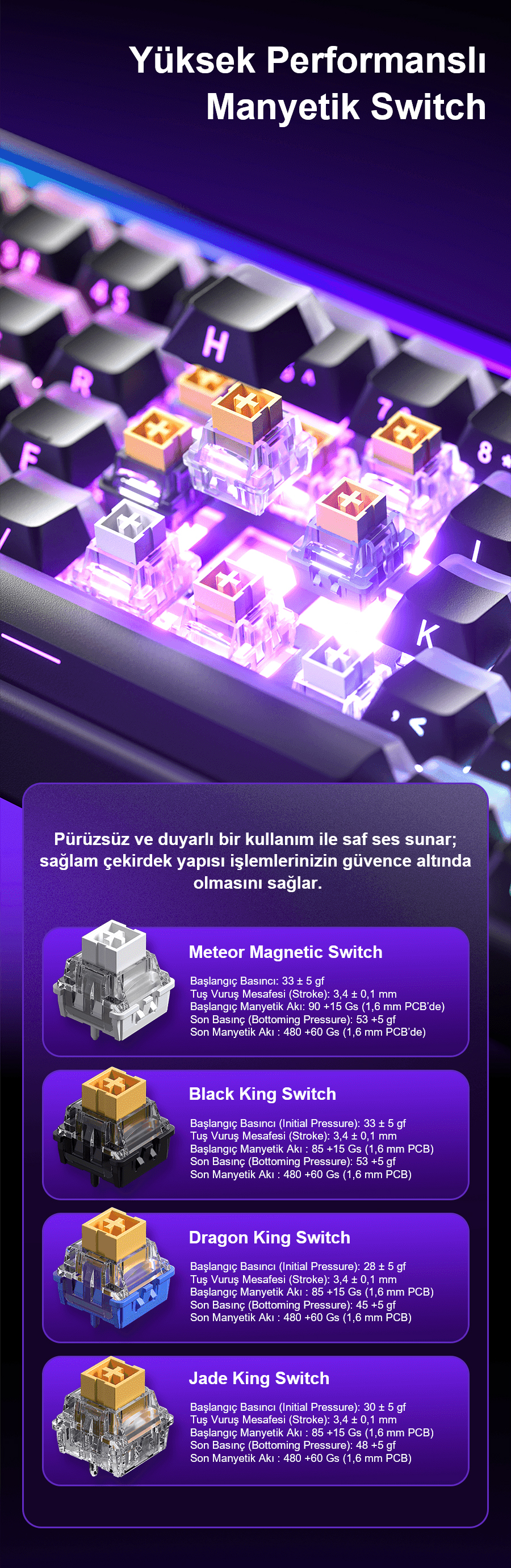 Bu manyetik klavye, geleneksel mekanik klavyelerin ötesine geçerek Jade King manyetik switch teknolojisini kullanır. Her manyetik switch, Hall Effect sensörü ile donatılmıştır ve 33 gf tetikleme kuvveti sunar. Ayrıca, 0.01 mm hassasiyet ayarı sayesinde kullanım deneyimini tam olarak kişiselleştirmenize olanak tanır. Jade King Switch’ler sayesinde daha uzun ömürlü ve tutarlı bir performans elde edersiniz.