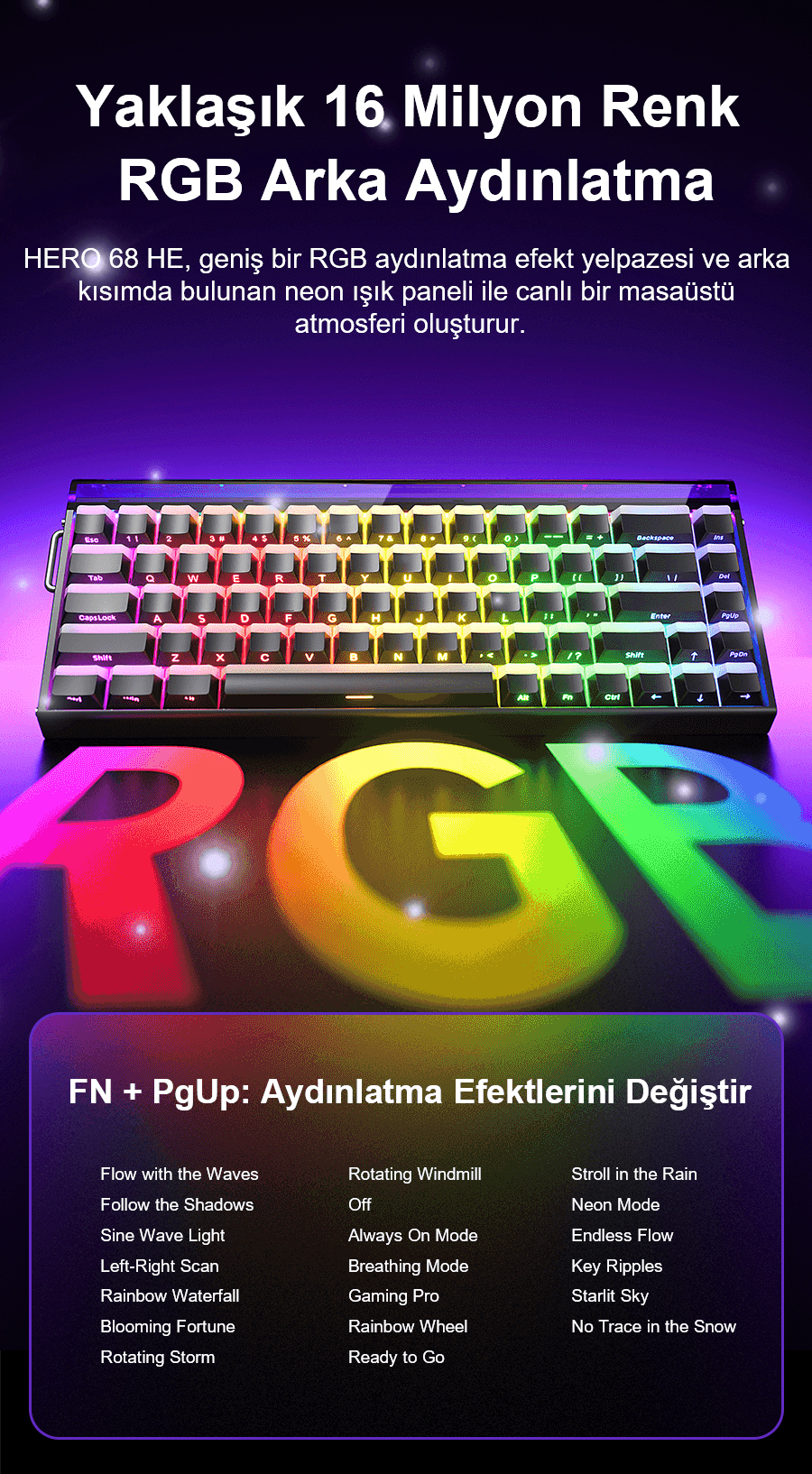 - Aydınlatma: 16.8M RGB, Double Shot PBT ışık geçiren side printed tuş takımı