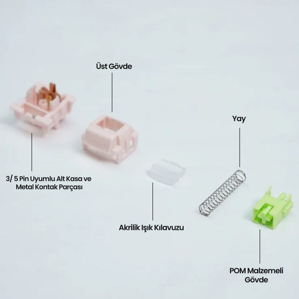 Switch'in yapısında kullanılan L5000 + POM malzeme birleşimi, yüksek düzeyde sürtünme direnci ve dayanıklılık sağlar. Bu yapı, her bir tuş vuruşunun sessiz, kaygan ve istikrarlı bir biçimde gerçekleşmesine katkıda bulunur. Sürtünme oranının düşük olması, yazım hissini ipeksi ve akıcı hale getirir.