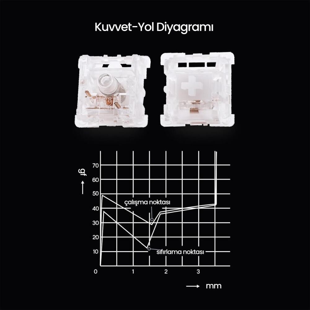 49gf’lik başlangıç kuvveti ile her tuş vuruşunda net bir direnç sunar ve 30gf ile iletim sağlanır. Bu sayede yazarken ya da oyun oynarken tuşlara basma hissini daha belirgin ve kontrollü şekilde alırsınız.