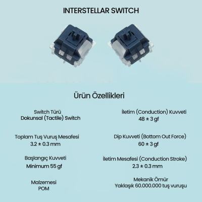 LEOBOG Interstellar Switch, dokunmayı hissedebileceğiniz bir kaplama—tactile switch—modeli olarak öne çıkıyor. Katı, net bir tıklama hissi sunarak yazı yazmayı veya oyun oynarken size fiziksel geri bildirim sağlar. Üst düzey malzeme kalitesi ve teknik özellikleriyle uzun süreli ve konforlu bir kullanım sunar.