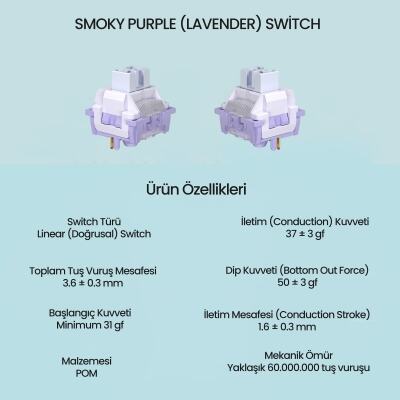Smoky Purple (Lavender) Switch, yalnızca konfor değil, aynı zamanda yüksek performans da sunar. 3.6 ± 0.3 mm toplam tuş mesafesi ve 1.6 ± 0.3 mm iletim mesafesi, her tuş basımının hassasiyetle algılanmasını sağlar. Yaklaşık 60 milyon tuş vuruşu ömrüyle, uzun süreli kullanımda bile performans kaybı yaşanmaz. Bu teknik değerler, Lavender Switch'in hem dayanıklılığını hem de güvenilirliğini kanıtlar.