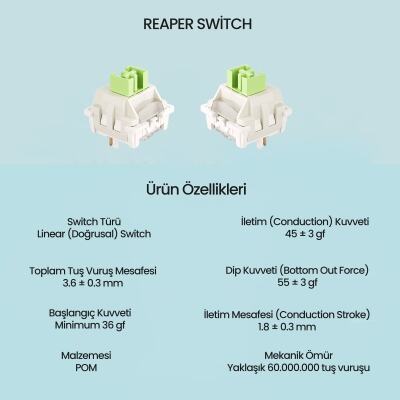 Oyun ve yazı yazma tutkunları için tasarlanan Reaper Switch, yalnızca 36gf’lik hafif bir harekete geçirme kuvvetiyle başlar ve 55gf’lik yumuşak bir alt kuvvete ulaşır. Bu da her tuş vuruşunun zahmetsiz, doğal ve keyifli hissettirmesini sağlar. Hem iş hem de oyun için ideal bir yazım deneyimi sunar.