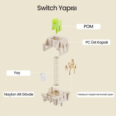 Tamamen POM (Polyoksimetilen) malzemeden üretilen bu switch’ler, derin ve tatmin edici bir ses profili ile birlikte ipeksi bir akıcılık sunar. Kendinden yağlayıcı özelliği sayesinde sürtünmesiz bir performans ve zamanla azalmayan dayanıklılık sağlar.