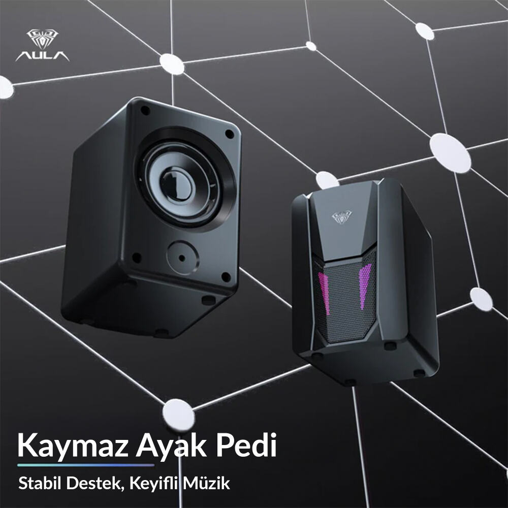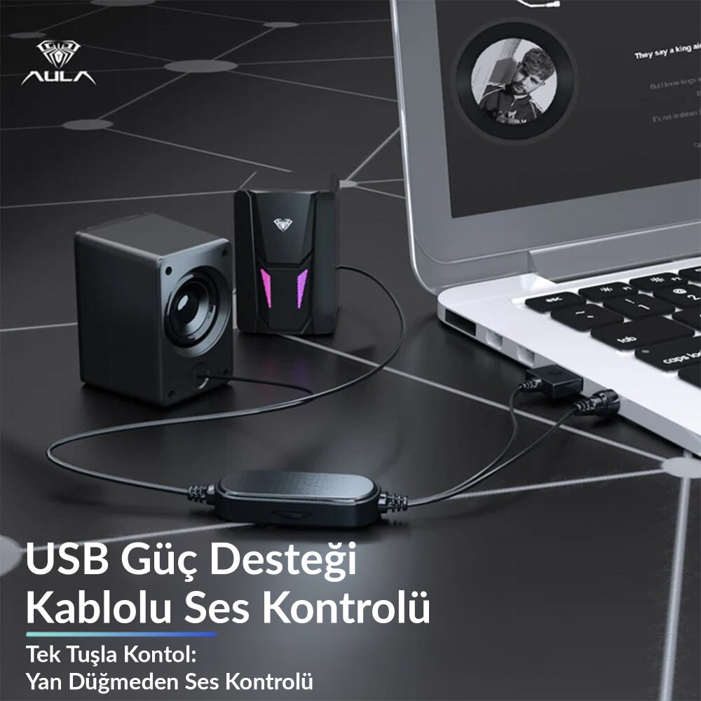Aula N-108 1+1 USB / Aux Stereo 2.0 RGB Masaüstü Gaming Oyuncu Hoparlör Speaker Ses Sistemi, ses çıkışı bulunmayan masaüstü bilgisayarınızın Jak bağlantısı ile kaliteli ve temiz bir ses çıkışına sahip olmasını sağlar. İçerisinde bulunan güçlü sürücüler müzik dinlerken veya oyun oynarken basları ve tizleri en net şekilde size aktarır. Tak çalıştır kullanımı sayesinde sürücü kurulumuna gerek duymadan kullanabilirsiniz. Stereo 2.0 sayesinde müzikleri en kaliteli şekilde dinleyebilir ve hikaye temelli oyunların atmosferine en iyi şekilde girebilirsiniz. Ses ayarı tekerleği, bilgisayar bağlantı kablosu üzerinde bulunan N-108 masanızdaki simetriyi bozmaz ve size en uygun ses oranını bulma imkanı tanır. Alt kısmında bulunan kaymaz pedler masanızın yüzeyi ne olursa olsun kaymaz böylece oluşabilecek olumsuz durumların önüne geçer. Ön kısmında bulunan RGB aydınlatma odanızın atmosferini canlandırır. ABS malzemeden üretilen dış kasası N-108'i darbelere karşı korur.