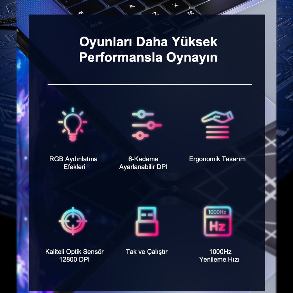 Bu gaming mouse, 12800 DPI'ya kadar çıkabilen gelişmiş optik sensör teknolojisi ile donatılmıştır. 7000 FPS kare hızı, 60 inç/saniye hız ve 20G ivme değerleri ile oyuncu mouse kategorisinde üstün performans sergiler. 6 farklı DPI seviyesi (1200/1600/2400/4800/7200/12800 DPI) sayesinde her oyun türü için optimal hassasiyet ayarı yapabilirsiniz. 1000Hz geri dönüş oranı ile kablolu oyuncu fare deneyiminiz hiç olmadığı kadar hızlı ve kesin olacak.