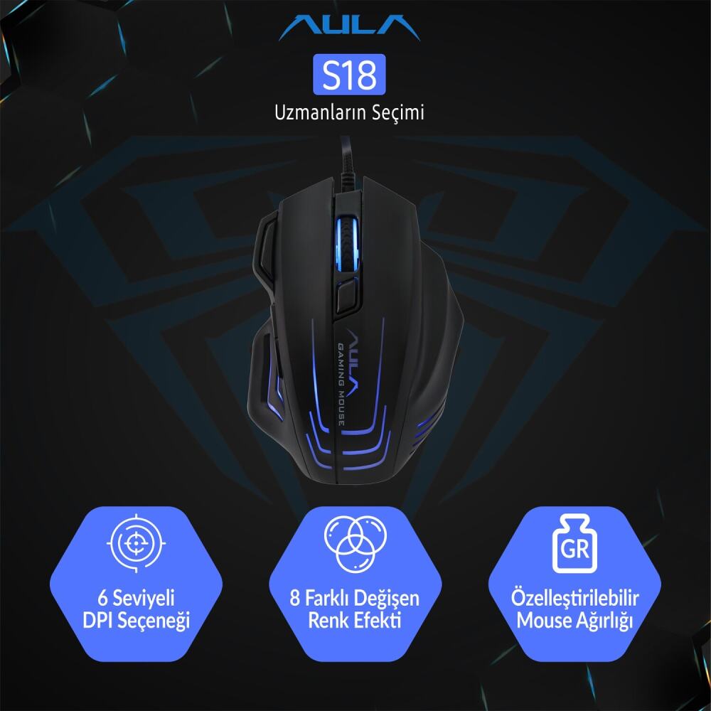 AULA S18 gaming mouse, kablolu USB bağlantı ile çalışır. 1.8 metre uzunluğundaki kablo, masaüstü kullanım için yeterli hareket alanı sağlar.