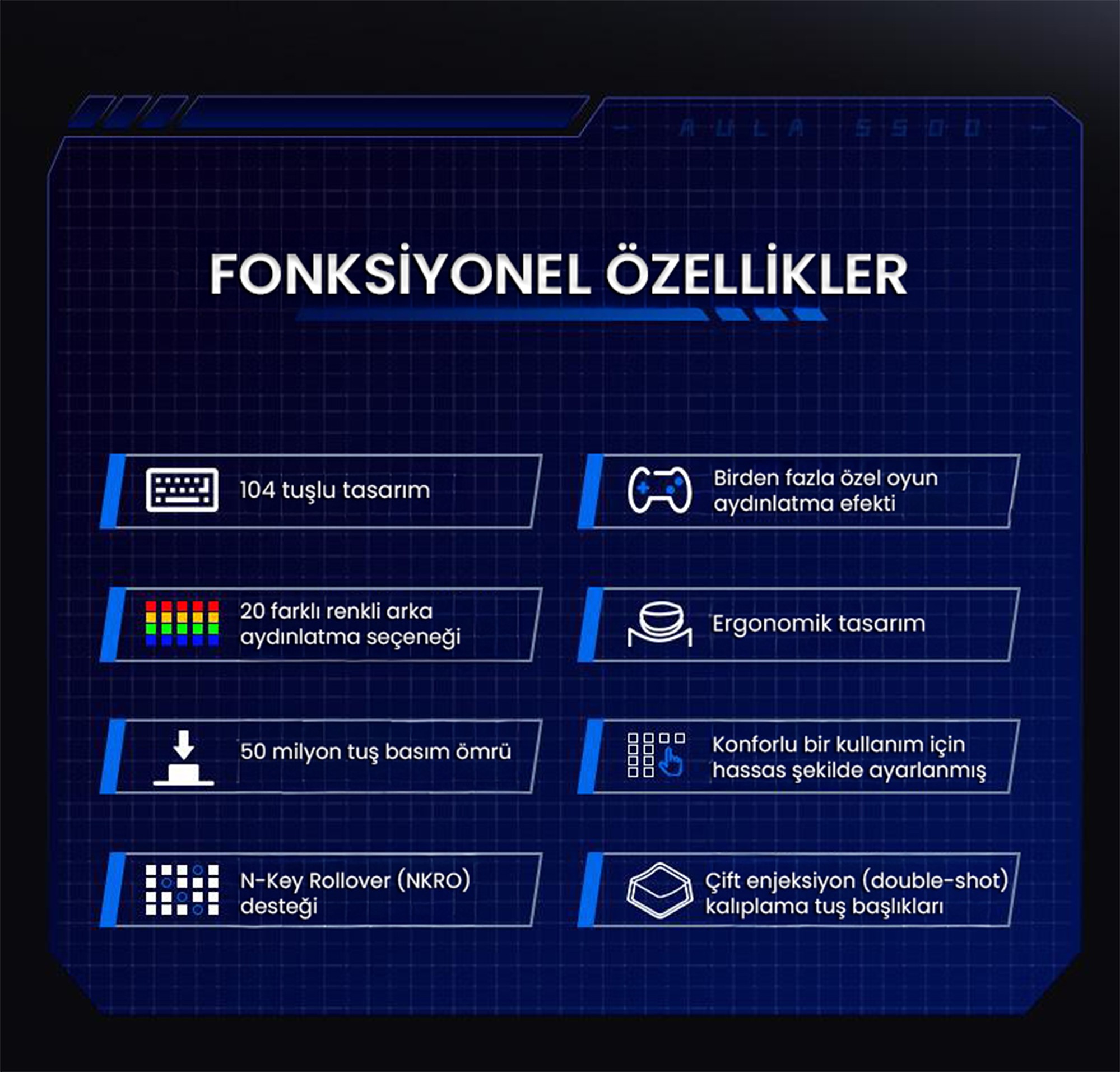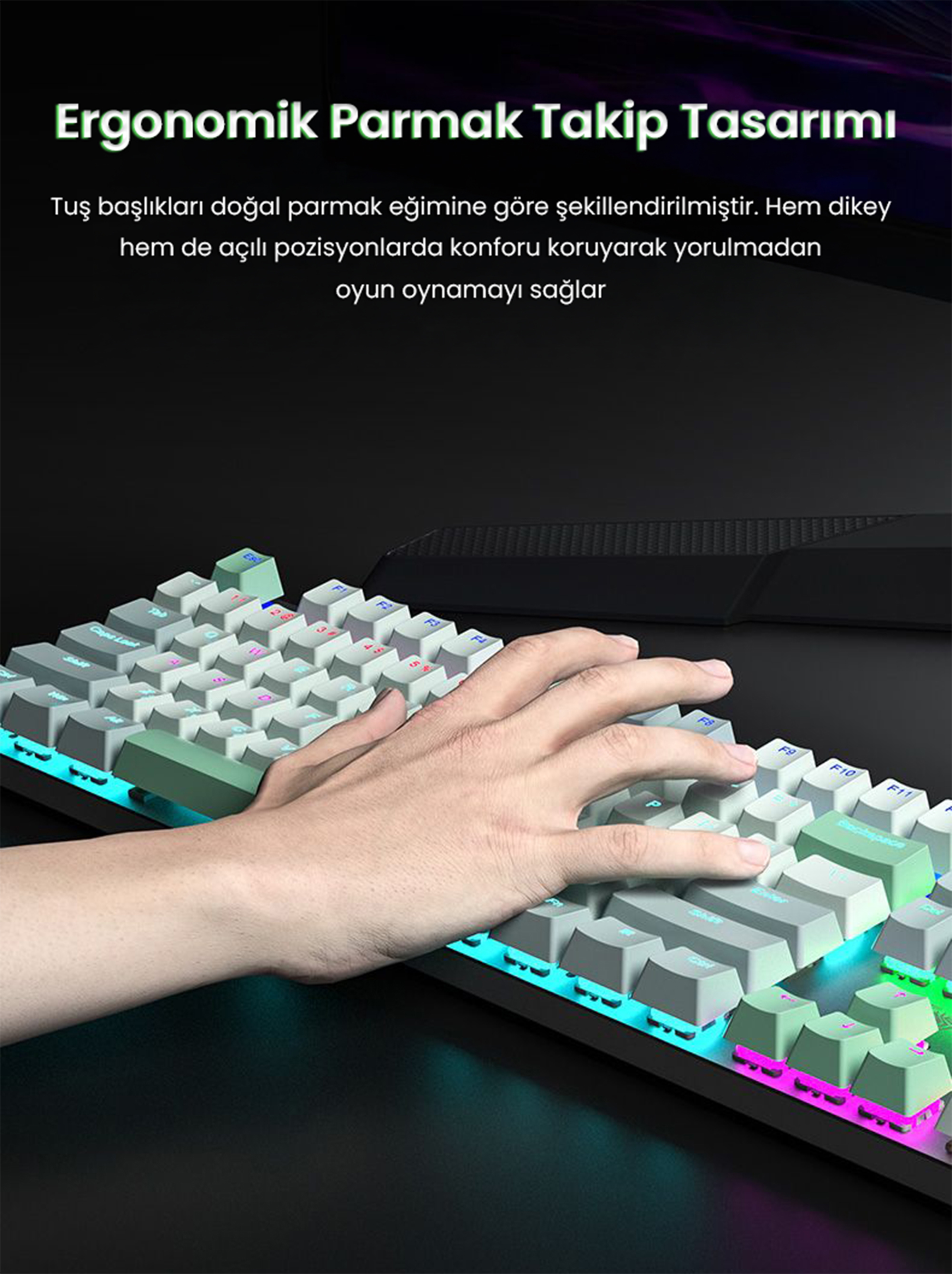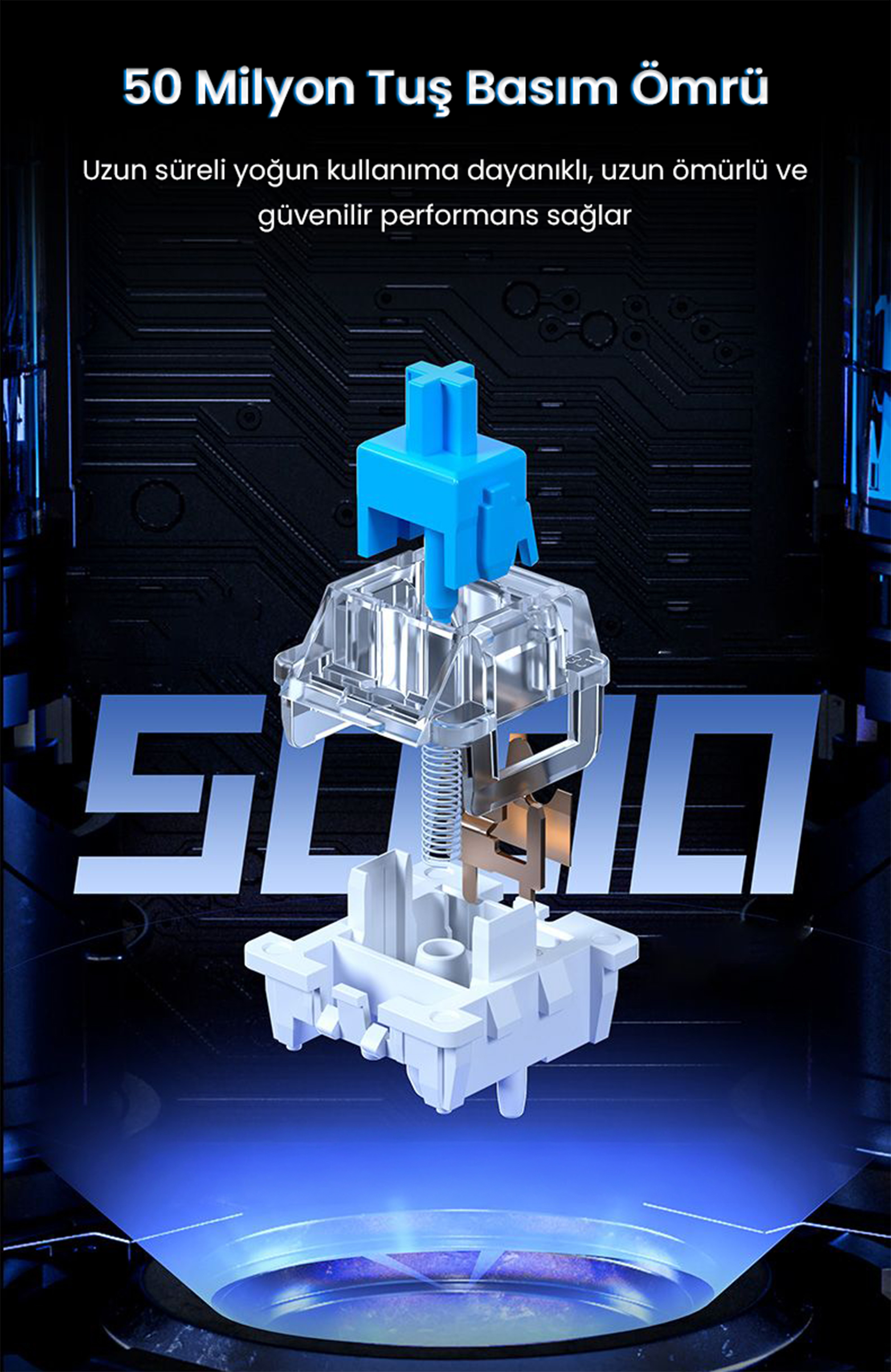 E-spor odaklı mekanik klavye, hızlı tepki süresi ve net tuş hissi sunar. 50 milyon tuş basım ömrü, uzun süreli ve yoğun kullanımda bile dayanıklılığı garanti eder. Anti-ghosting teknolojisi sayesinde FPS, MOBA ve RPG oyunlarında üstün performans elde edersiniz.