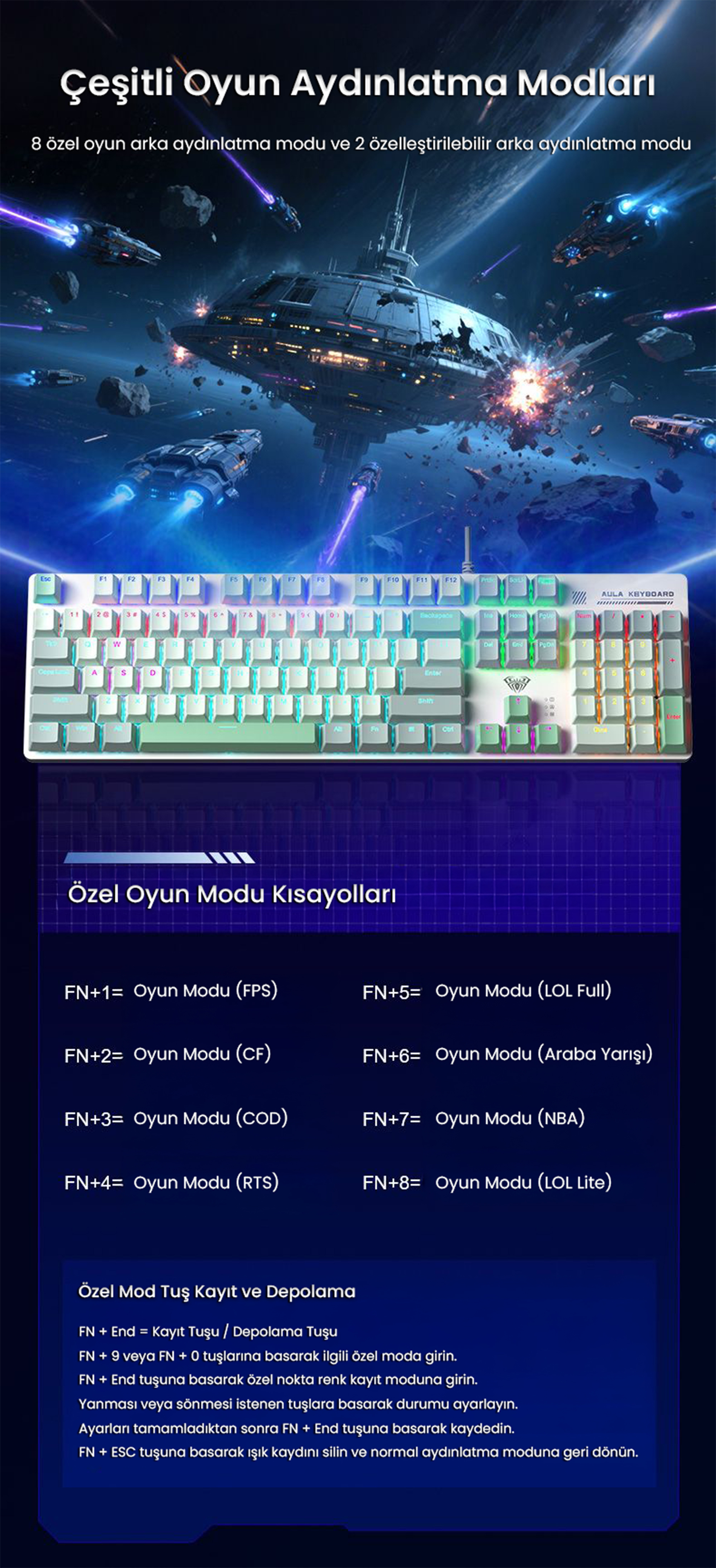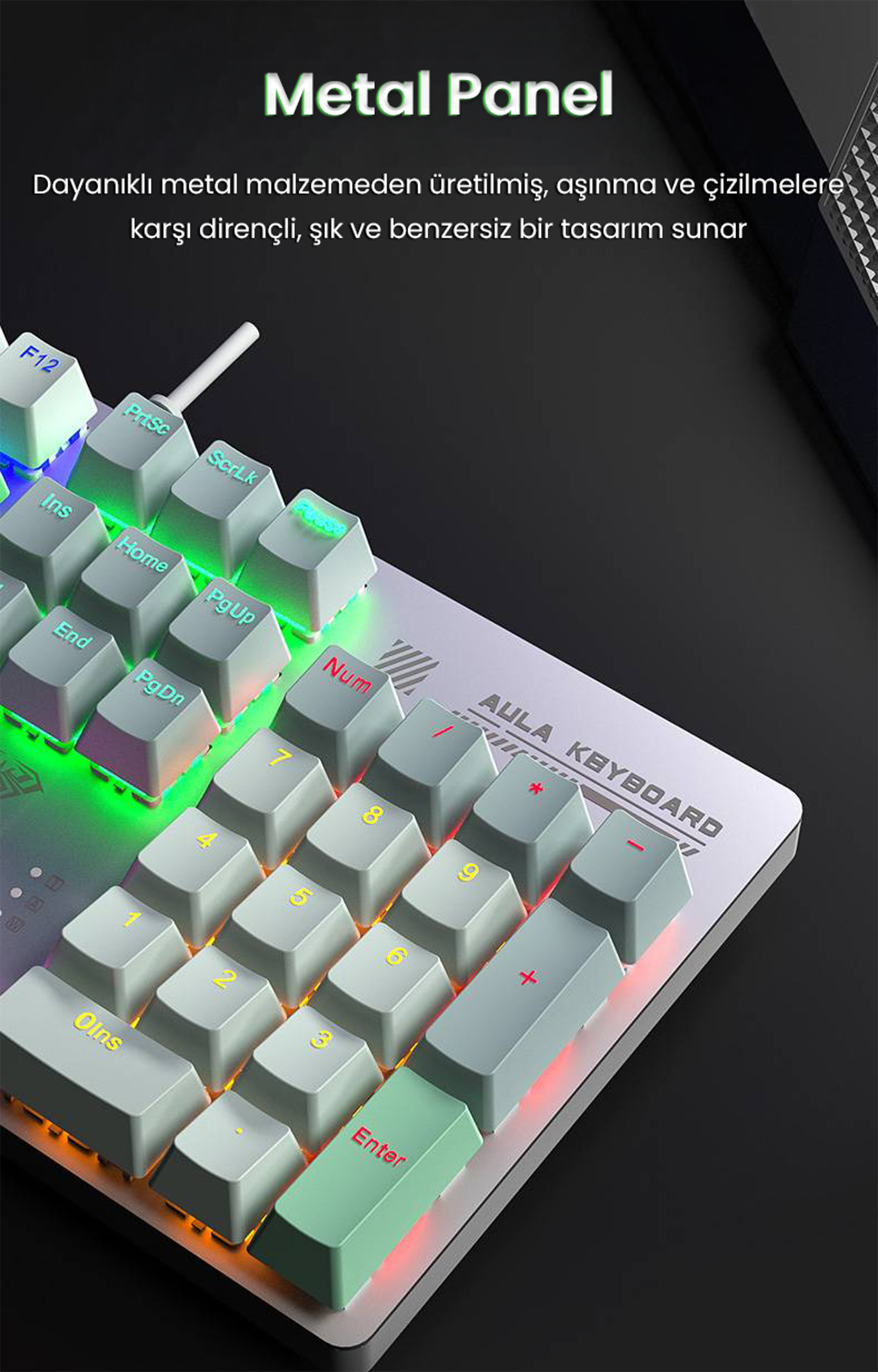 Aula S500 100% kablolu mekanik gaming klavye, hem profesyonel oyuncular hem de yoğun klavye kullananlar için tasarlanmış tam boyutlu (full size) yapısıyla maksimum verimlilik sunar. Numpad’li 100% klavye düzeni, oyunlarda hızlı komutlar ve ofis çalışmalarında pratik sayı girişi sağlar. Dayanıklı yapısı, şık tasarımı ve gelişmiş RGB aydınlatmasıyla performans ve estetiği bir arada sunar.