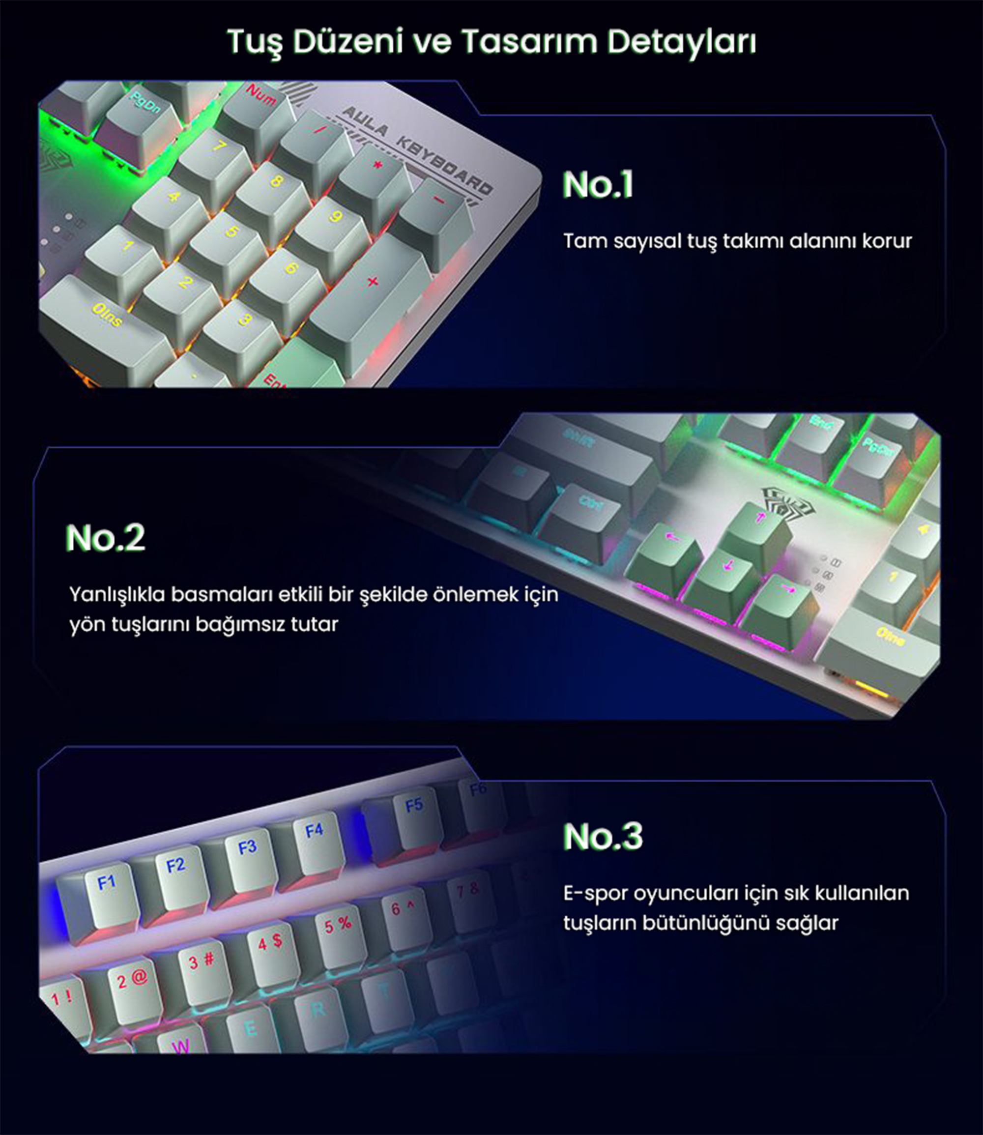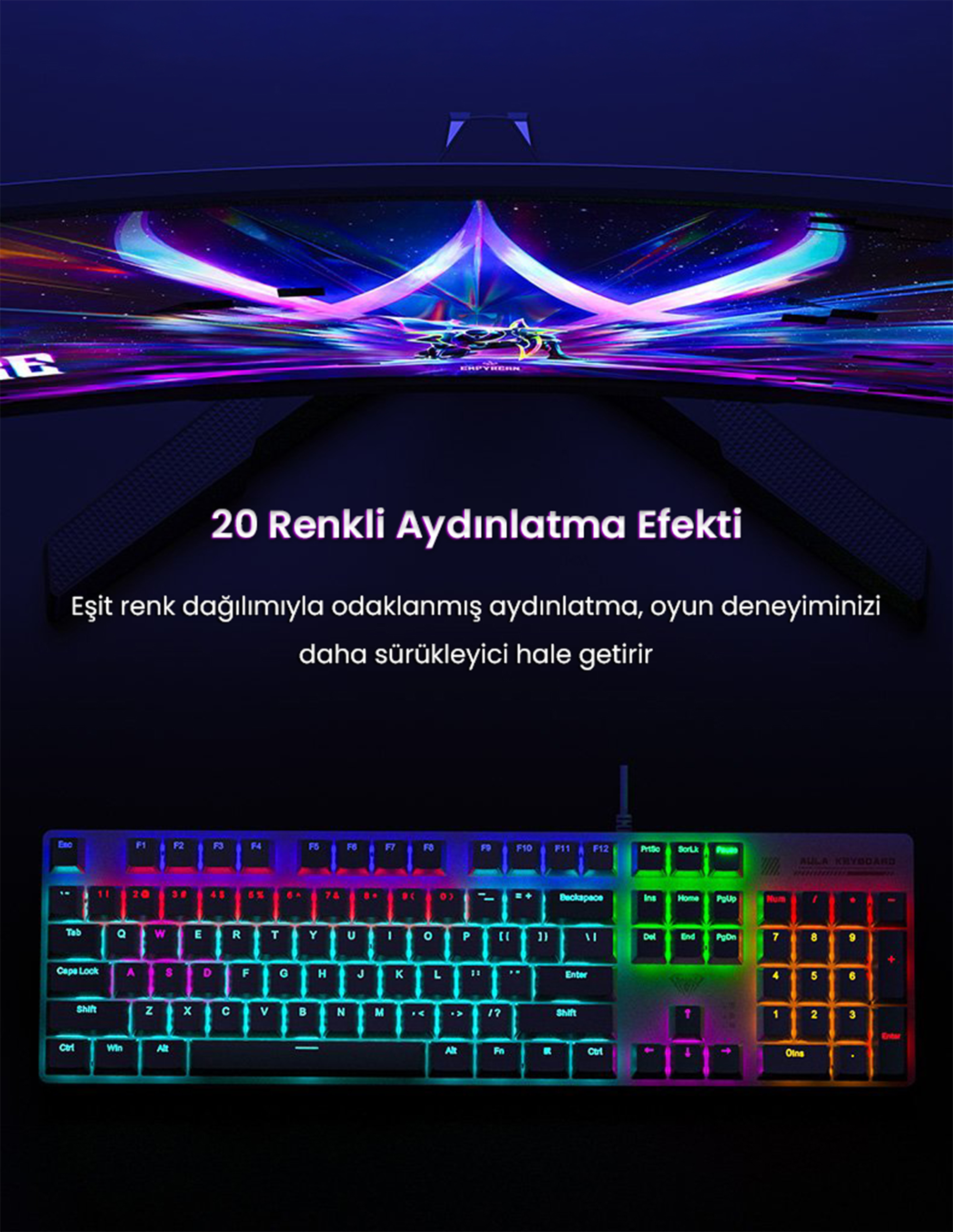 Tam boyutlu klavye tasarımı, yön tuşları ve sayısal tuş takımıyla hem oyun hem de iş kullanımında büyük avantaj sağlar. Numpad’li mekanik klavye, özellikle veri girişi, muhasebe, yazılım ve MMO oyunlarında hız ve kontrol kazandırır. Geniş tuş dizilimi sayesinde alışma süresi olmadan konforlu kullanım sunar.