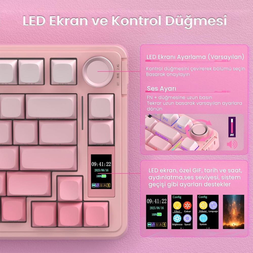 AULA S75 PRO’nun sağ yanında yer alan 1.14 inç TFT ekran, klavyeye çok yönlü bir kontrol merkezi kazandırır. Ekran üzerinden sistem modu, saat, takvim, aydınlatma ayarları, batarya durumu ve bağlı cihaz bilgileri görüntülenebilir. Klavyenin üst kısmında bulunan çok fonksiyonlu döner kontrol düğmesi, bu menü içerisindeki tüm seçenekleri hızlı ve pratik şekilde yönetmenizi sağlar. Parlaklık, hız, renk, ses seviyesi ve sistem geçişi tamamen bu düğme ile kontrol edilir.