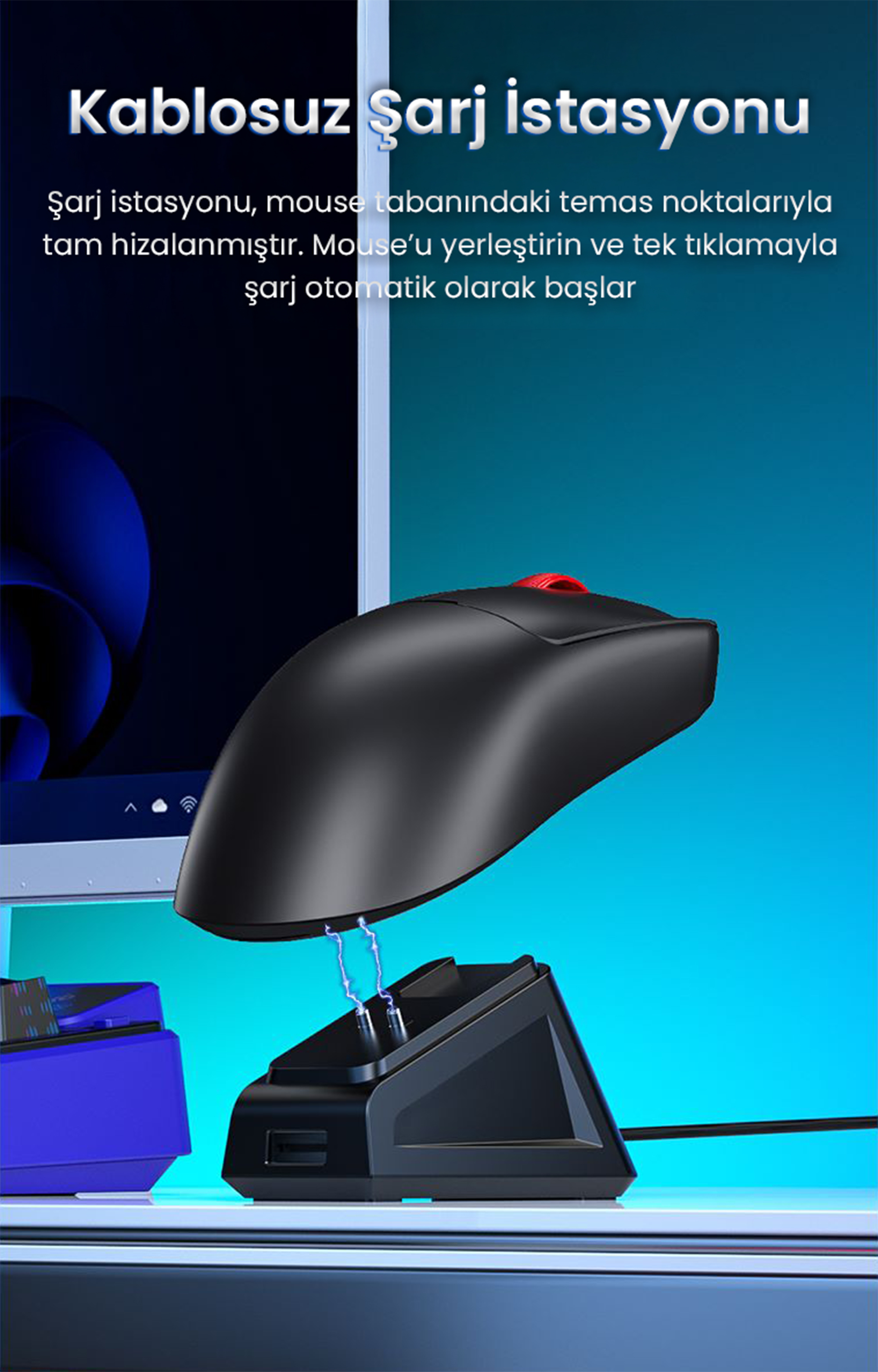 Type-C şarj portu ve şarj tabanı sayesinde, mouse hem kablolu modda çalışırken şarj olur hem de kablosuz kullanımda enerji kaynağı sağlar. 500mAh batarya kapasitesi uzun kullanım süreleri sunar ve kompakt tasarımıyla taşınabilirliği kolaydır.