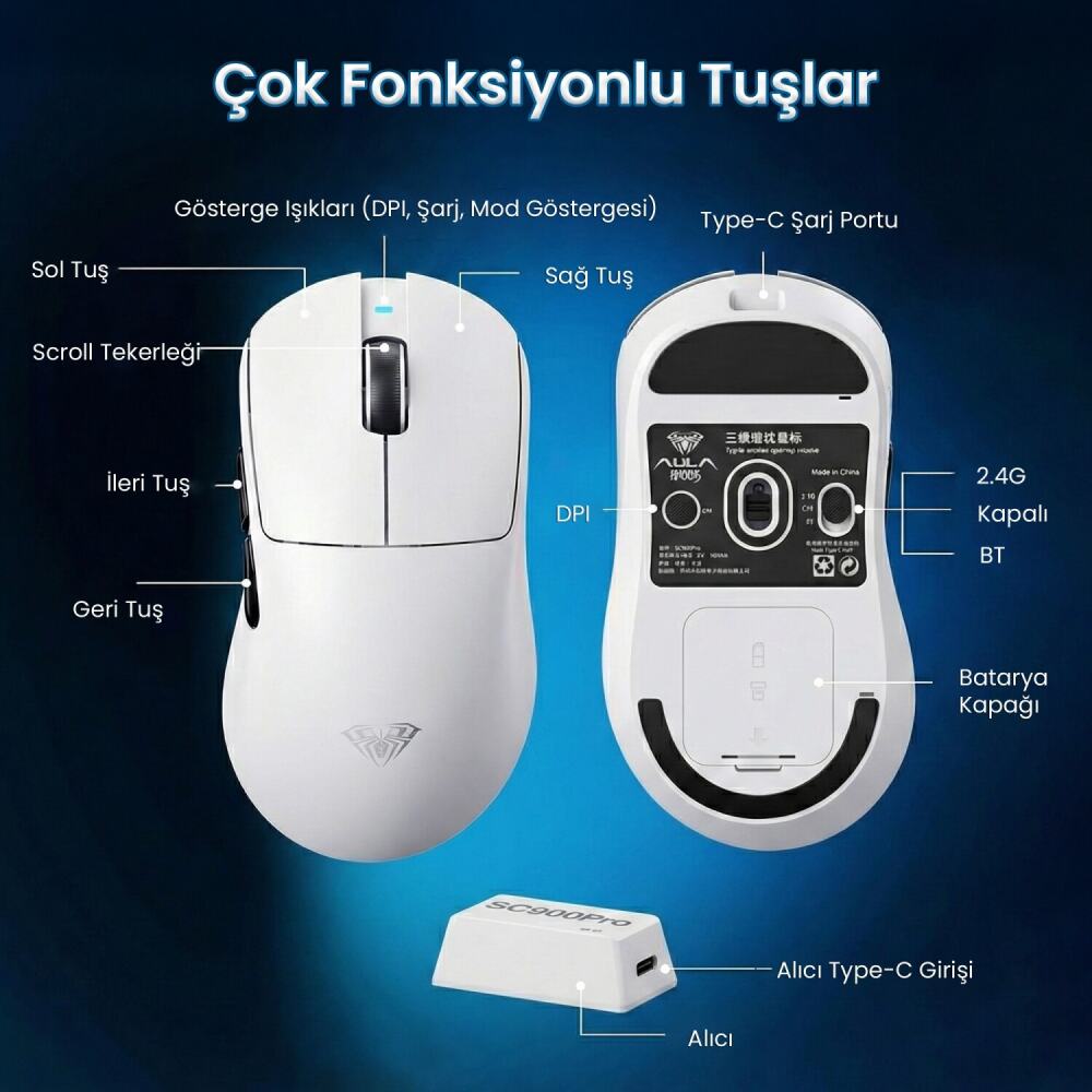 AULA SC900PRO, Wired / 2.4G / Bluetooth olmak üzere üç farklı bağlantı seçeneğine sahiptir. Masaüstü veya dizüstü bilgisayarda kolay kullanım sağlar. Bluetooth ile kablosuz bağlantı kurmak için farenin altındaki anahtarı BT moduna getirin ve sol, orta ve sağ tuşlara 3 saniye basılı tutarak eşleştirme moduna geçin. 2.4G bağlantı için alıcıyı takın ve gerektiğinde zorunlu eşleştirme yöntemi ile bağlantıyı sağlayabilirsiniz.