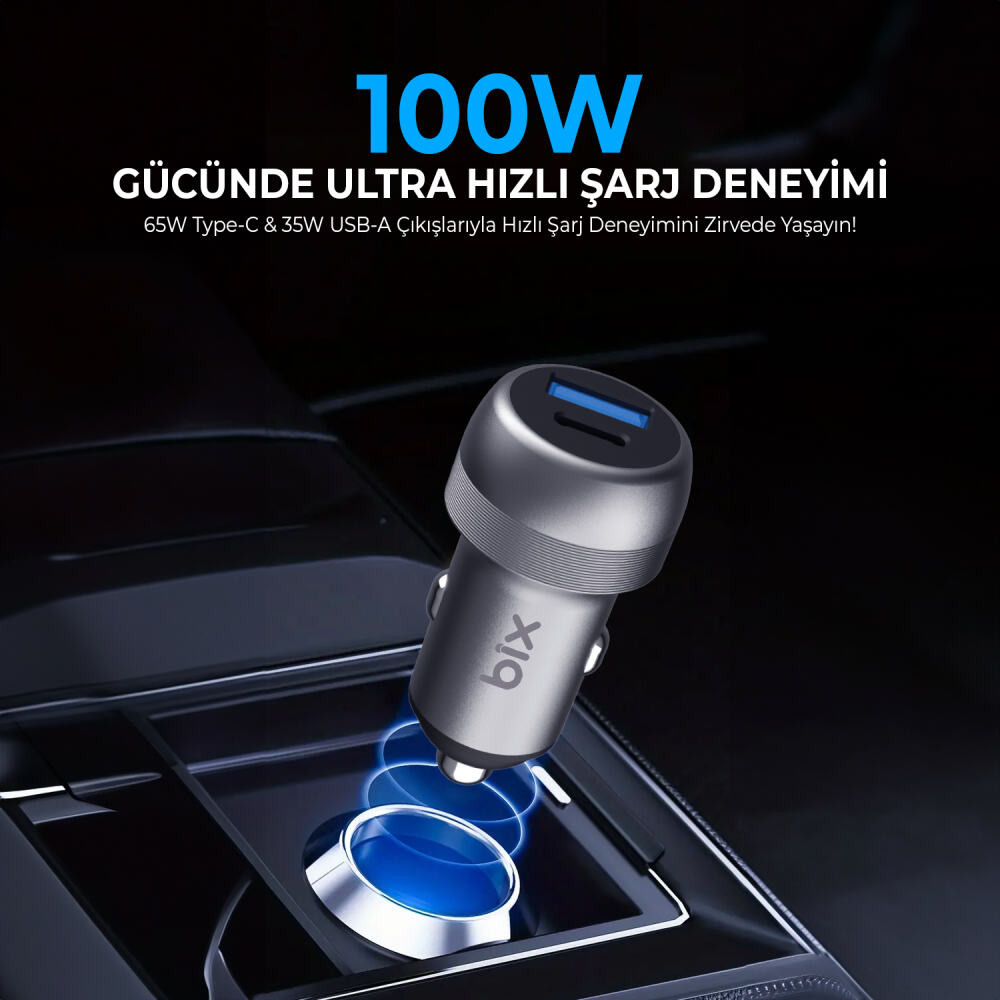 Bix BXAC100W 100W Type-C PD 65W ve USB-A QC 35W PPS Destekli Çift Çıkışlı Mini Araç Şarj Cihazı, hızlı şarj desteğine sahip USB-C ve USB-A çıkışlarıyla akıllı cihazlarınız için 100W’a kadar güç çıkış sağlayabilmektedir. Araç çakmaklık kısmını kullanarak, akıllı cep telefonları, navigasyon, araç içi kameradan tablete, hoparlörlerden MacBook’lara ve diğer USB-C dizüstü bilgisayarlara kadar çeşitli şarj ihtiyaçlarını rahatlıkla karşılar. 100W çıkışa sahip bu araç şarj adaptörü, MacBook Pro 16″ bilgisayarınızı yalnızca 1,5 saatte %0’dan %100’e şarj edebilir. Böylece düşük pil endişenizi büyük ölçüde azaltabilmektedir. Dizüstü bilgisayarlar, iPhone, Samsung, Huawei ve tabletler gibi 2 cihazı aynı anda yıldırım hızında şarj edilmesini desteklemektedir. PD 3.0 ve QC 3.0 şarj protokolleriyle birlikte, Type-C portu 65W, USB-A portu ise max. 35W güç sunmaktadır.