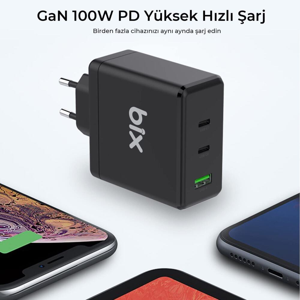 Bix 100W USB Type-C QC 4.0 PD 3.0 Gan 3 Portlu Hızlı Şarj Cihazı, iki adet Type-C ve 1 adet USB-A bağlantı noktalarıyla, telefonlara, tabletlere, dizüstü bilgisayarlara ve daha fazlasına 100W’a kadar güç sağlamaktadır. Aşırı sıcaklığı önleyen Dinamik Sıcaklık Sensörleri’ne ve cihazlarınızı korumak için güç çıkışlarını ayarlayan akıllı Smart Chip’e sahiptir. Aşırı akım koruma özellikleri sayesinde güvenli şarj sağlar.