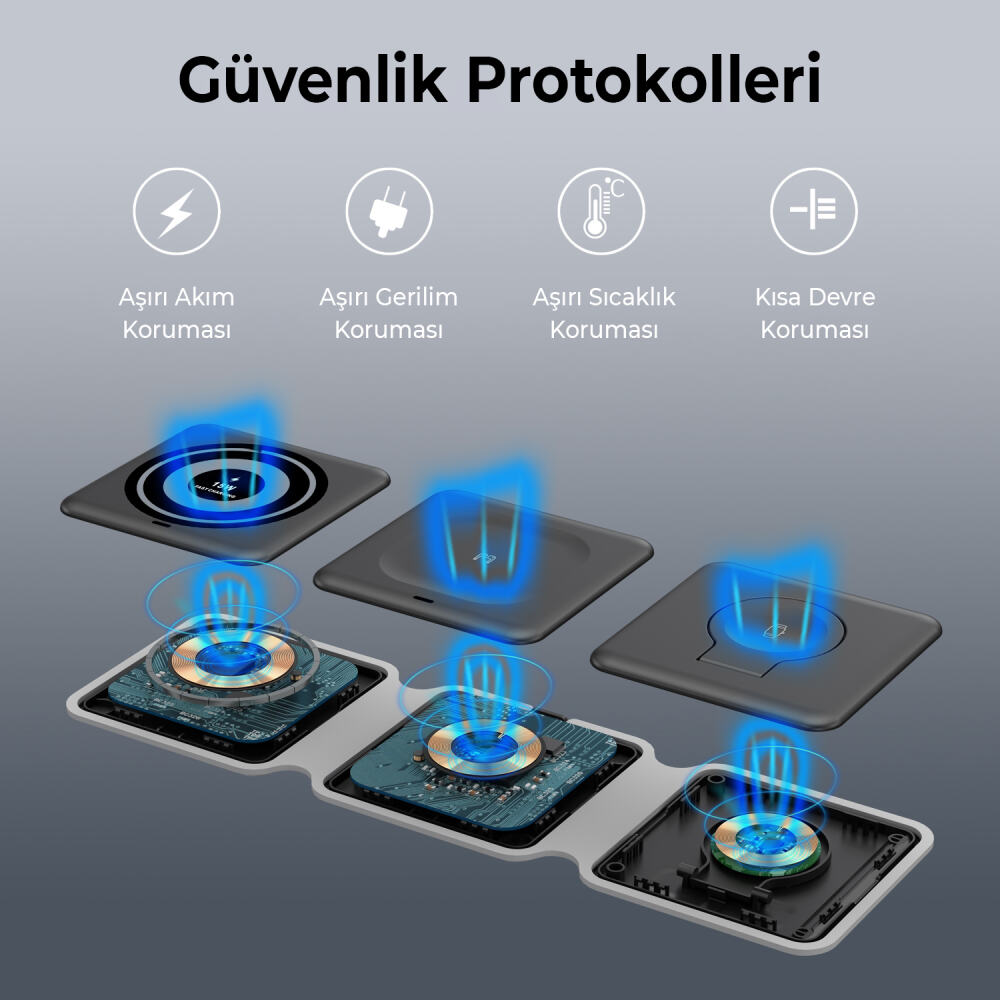 Tek bir cihazla iPhone, Apple Watch ve AirPods’ları verimli bir şekilde şarj edebilirsiniz. Manyetik şarj teknolojisi, kablosuz şarj bobininin akıllı telefonla kolayca hizalanmasını sağlar ve hızlı ve istikrarlı bir şarj deneyimi sağlar. Mükemmel 3’lü şarj dock istasyonu başlıca Huawei/Xiaomi/Samsung S8/S9 ve üstü gibi diğer akıllı telefonlar ve Apple ürünleri için uygundur. iPhone 15/14/14 Pro/14 Pro Max/13/13 Pro/13 Pro Max/13 mini/12/12 Pro/12 Pro Max/12 mini/11/11 Pro/11 Pro Max/XS/XR/XS MAX/X/8/8 Plus, Apple Watch 8/7/6/5/4/3/2/1/SE ve AirPods 1/2/3/Pro1/Pro2 ile uyumludur. Aşırı akım, sıcaklık, gerilim, radyasyon korumasına sahiptir. (Not: manyetik şarj yalnızca bu iPhone modelleriyle uyumludur: iPhone 15/Plus/Pro Max, iPhone 14/Plus/Pro Max, iPhone 13/Mini/Pro/Pro Max, iPhone 12/Mini/Pro/Pro Max. Farklı bir telefon modelinde Magsafe kullanmak için cihazın arka kısmına metal yüzük eklemeniz gerekmektedir.)