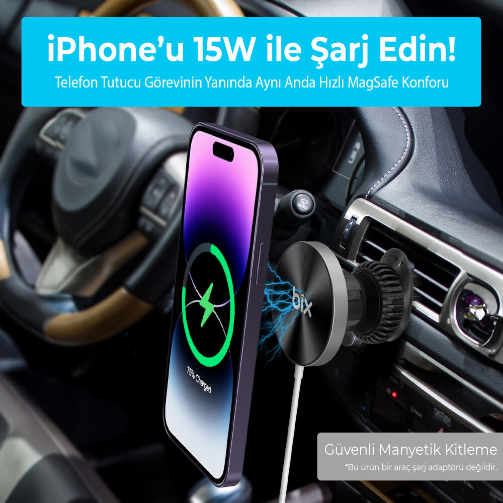 Bix BXCH2 15W Magsafe Kablosuz Şarj ve Manyetik Araç içi Telefon Tutucu, sürüş sırasında telefonunuzu güvenli bir şekilde kullanmanızı ve cihazınızın kablosuz bir şekilde şarj olmasını sağlar. Manyetik yüksek güçlü yapışkan ile telefon tutucu arazi şartlarında, tümseklerde, kasislerde ve bozuk yollarda yerleştirdiğiniz yerden düşmez. Havalandırma ızgarası için olan bağlantı aparatı ayarlanabilir kilit boyutu ile yerleştirdiğiniz ızgaraya kolayca uyum sağlar. Uzun araç yolculukları gibi durumlarda navigasyon bulunmayan araçlarınızda navigasyon işlevi gören telefonunuz sizin için en iyi konumda olur ve sunduğu üstün şarj teknolojisi ile şarjı bitmez. iPhone telefonlar için 15W şarj desteği ile cihazlarınızı hızlı şarj eder. Kablosuz şarj özelliği bulunmasına rağmen manyetik bağlantı özelliği bulunmayan cihazlarınızı manyetik kılıf kullanarak şarj edebilirsiniz. İçerisinde bulunan aşırı şarj ve kısa devre koruması sayesinde cihazınızda veya aracınızda herhangi bir soruna yol açmaz. ABS malzemeden tasarlanan ürün ufak çaplı darbelere karşı dayanıklıdır.
