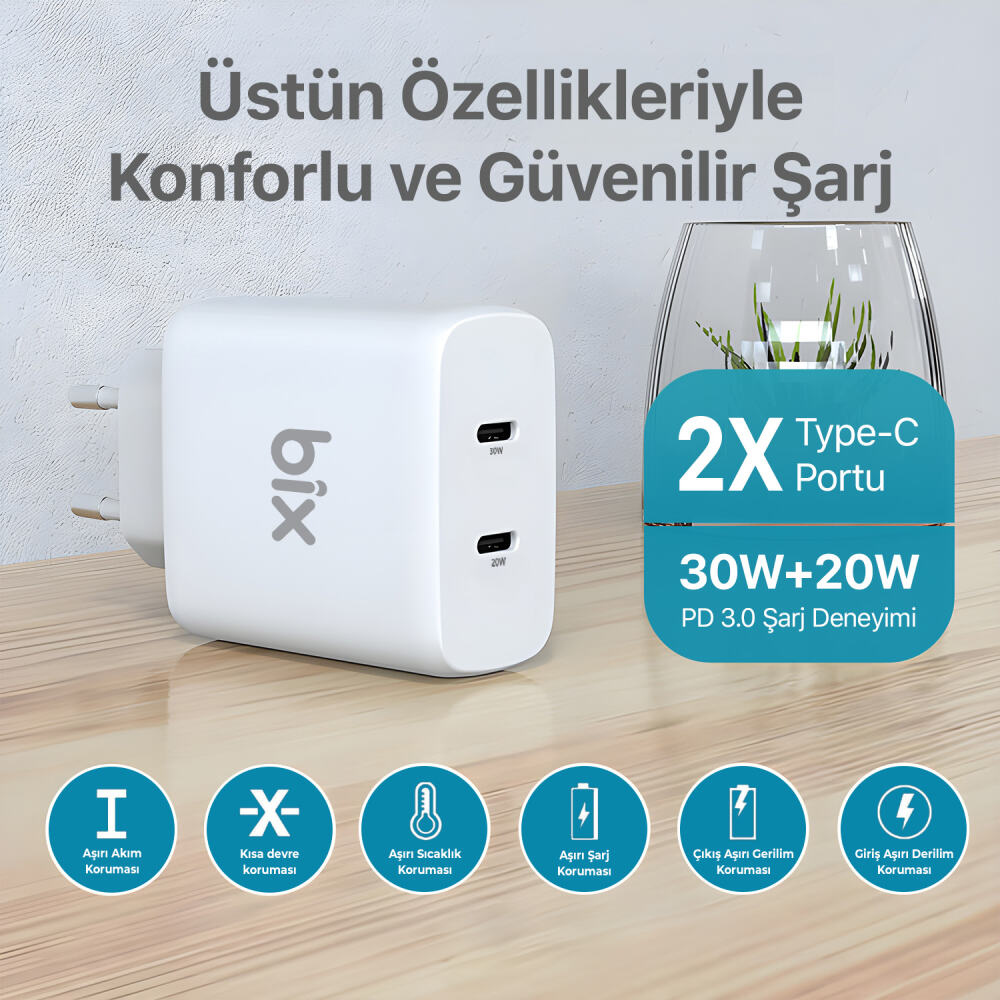 Bix 50W Type-C PD 3.0 Çift Çıkışlı Hızlı Şarj Cihazı'nın 2 adet Type-C bağlantı noktası ile donatılmış yapısıyla Type-C portlu cihazlarınızı aynı anda hızlı bir şekilde şarj edebilirsiniz. 2 Type-C girişinden birini kullanarak cihazınızı ister 30W ister 20W’lık giriş ile şarj edebilirsiniz. 2 Type-C portunu aynı anda kullanırsanız her iki bağlantı noktasının maksimum toplam çıkış gücü 50W olacaktır.