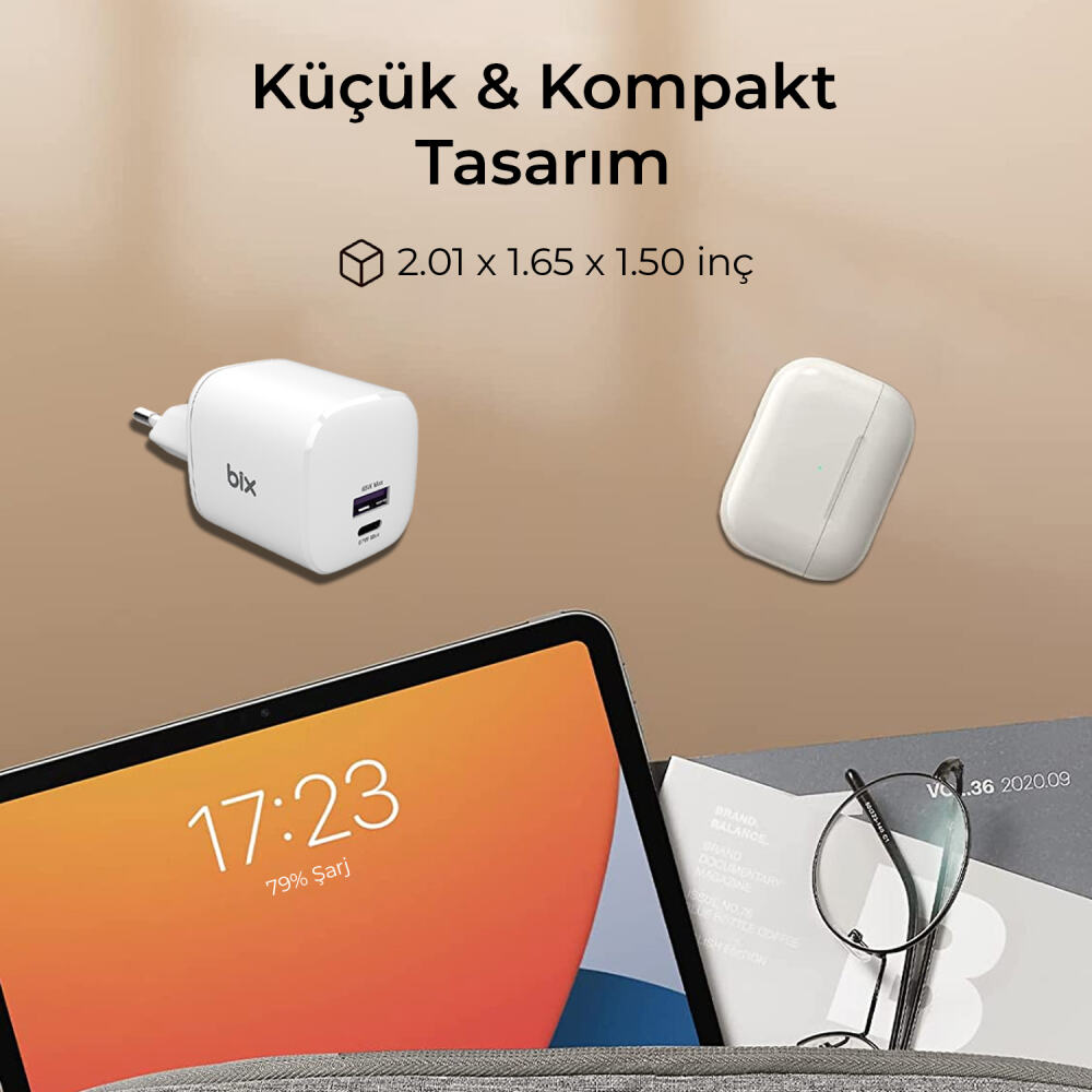Bix 67W SuperVooc 2.0 GaN USB ve Type-C PD Hızlı Şarj Cihazı'nı 1 adet Type-C ve 1 adet USB-A çıkış portu ile birden fazla cihaz ve kabloyla çalıştırabilirsiniz. Zamandan ve yerden tasarruf etmek için 2 cihazınızı aynı anda şarj edebilirsiniz. İki cihazı aynı anda en iyi hızlarda hızlı şarj etmek için bir adet 67W Type-C bağlantı noktası ve bir adet 65W USB-A bağlantı noktasına sahiptir, böylece priz karmaşasına son verir ve size temiz bir çalışma alanı sunar. En yeni GaN teknolojisiyle standart şarj cihazlarına göre daha küçük boyutlarda 67W gücüne kadar hızlı şarj imkânı sunmaktadır. MacBook gibi PD şarjı destekleyen dizüstü bilgisayarlarınızı ve akıllı telefonlarınızı aynı anda şarj edebilirsiniz. Ek olarak Qualcomm 3.0 teknolojisini kullanarak Snapdragon işlemcili telefonlarda da hızlı şarjı destekler.