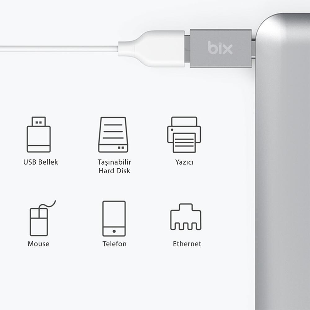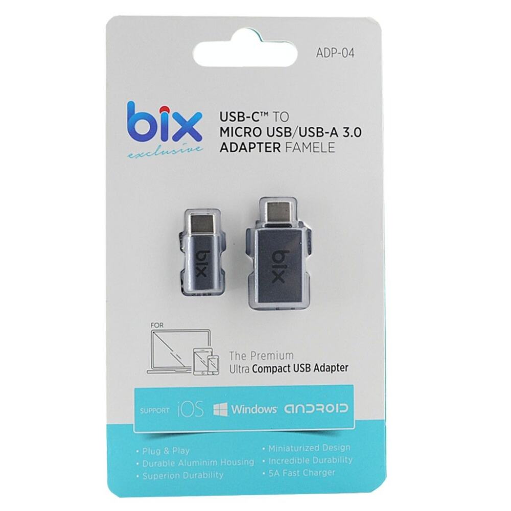 Bix ADP-04 Type-C Micro USB ve USB 3.0 Dönüştürücü Adaptör, yeni nesil Type-C girişe sahip telefonlarınızı Micro-USB kablolar ile şarj edebilmenizi, Type-C girişine sahip olan cihazlarınıza mouse, klavye, yazıcı ve sabit disklerinizi bağlamanıza olanak sağlar.