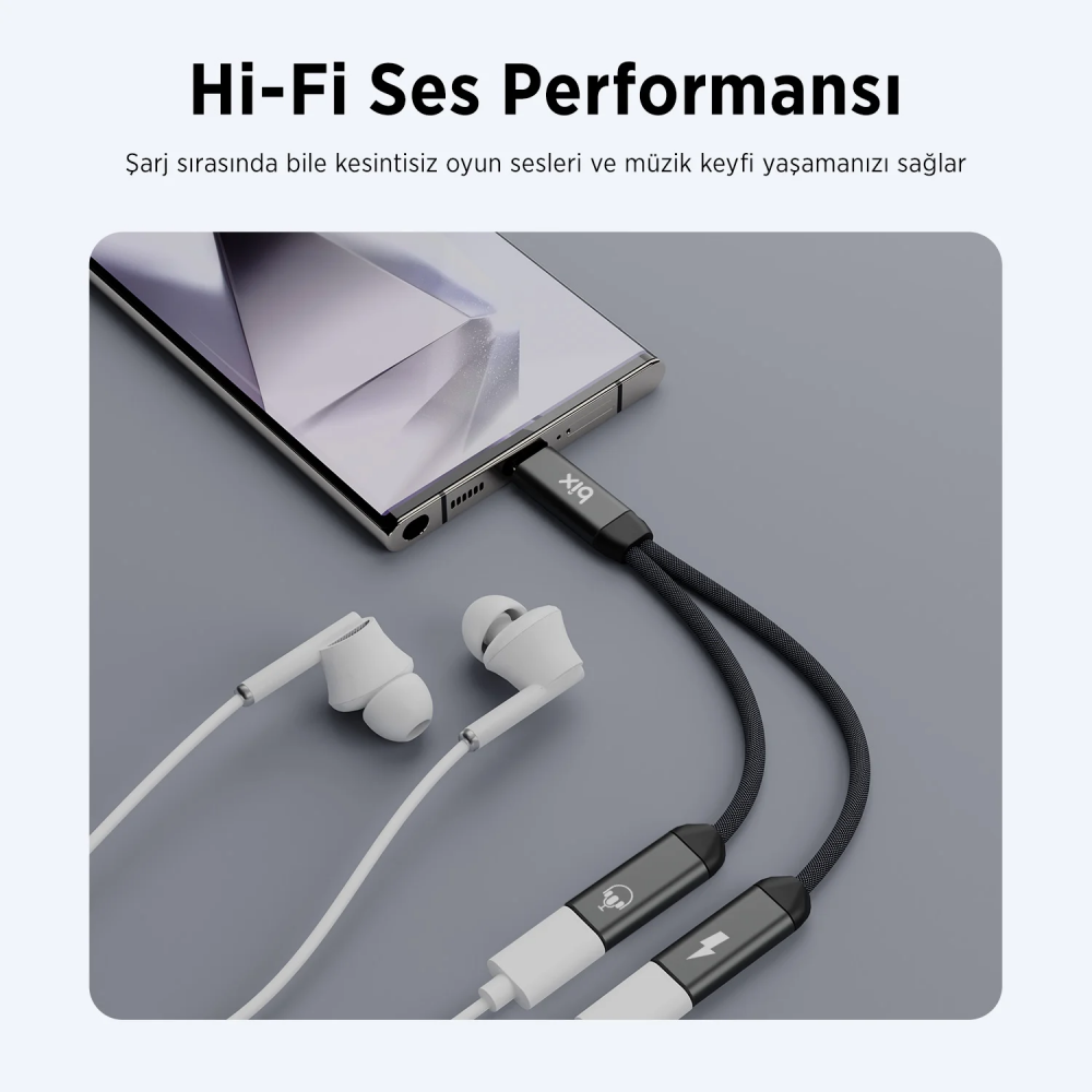 İki İşlevli Adaptör: Bix ADP-13, Type-C çıkışını hem Type-C kulaklık portuna hem de Type-C hızlı şarj portuna dönüştüren pratik bir 2’si 1 Arada dönüştürücüdür.