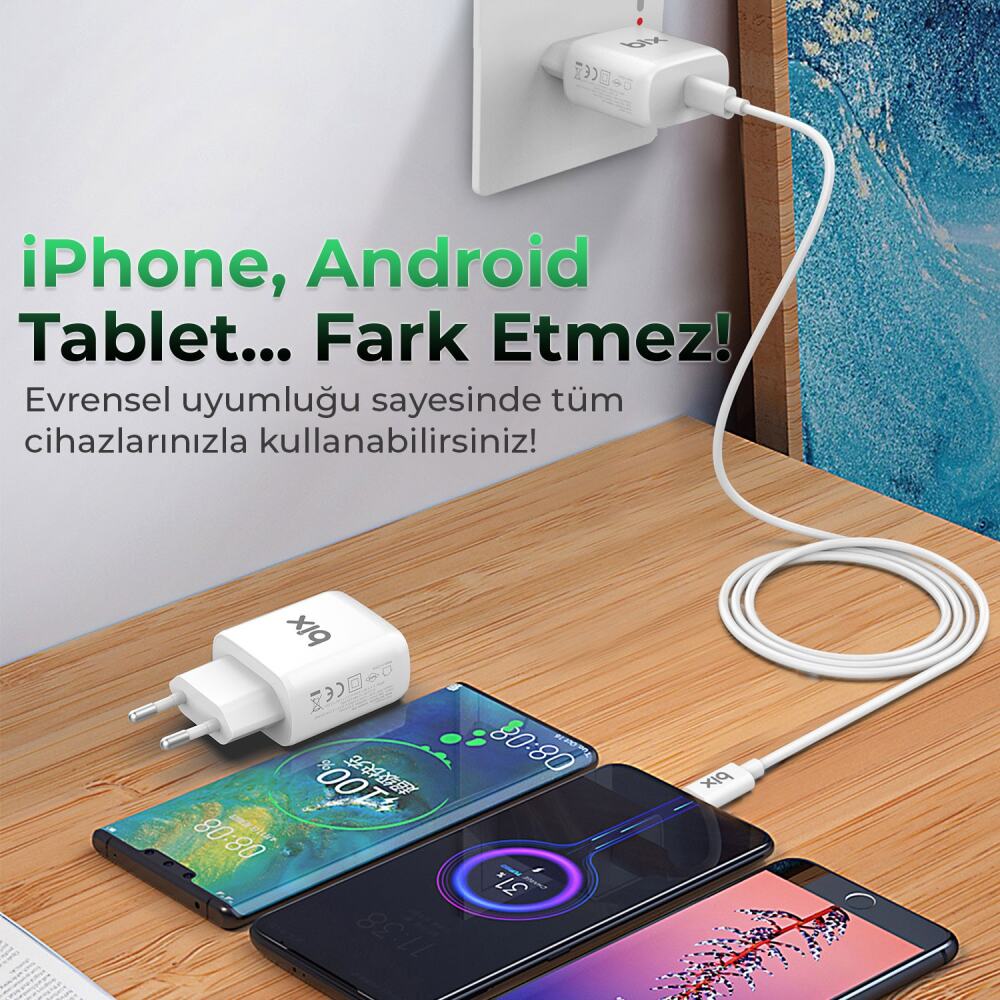 Bix BX-UC25TA 25W PD şarj adaptörü ile Type-C bağlantısına sahip uyumlu cihazlarınızı hızlı şarj edebilirsiniz. PD teknolojisine sahip olan şarj adaptörü, uyumlu cihazları ortalama 30 dakika içerisinde %50-60’a kadar şarj dolumu sağlar. Yüksek verimli hızlı şarj desteği ile eski geleneksel ev şarjlarına nazaran ortalama 4 kata kadar daha hızlı bir şekilde cihazlarınızı şarj etmektedir.