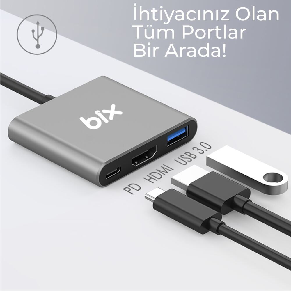 Bix BX13HB Type-C HDMI USB PD Dönüştürücü Adaptör ile Type-C portuna sahip olan cihazlarınızı HDMI bağlantı noktası üzerinden televizyon ve monitörlere bağlayabilirsiniz. Ayrıca sahip olduğu USB 3.0 portu üzerinden veri transferi gerçekleştirebilir ya da şarj edebilirsiniz.