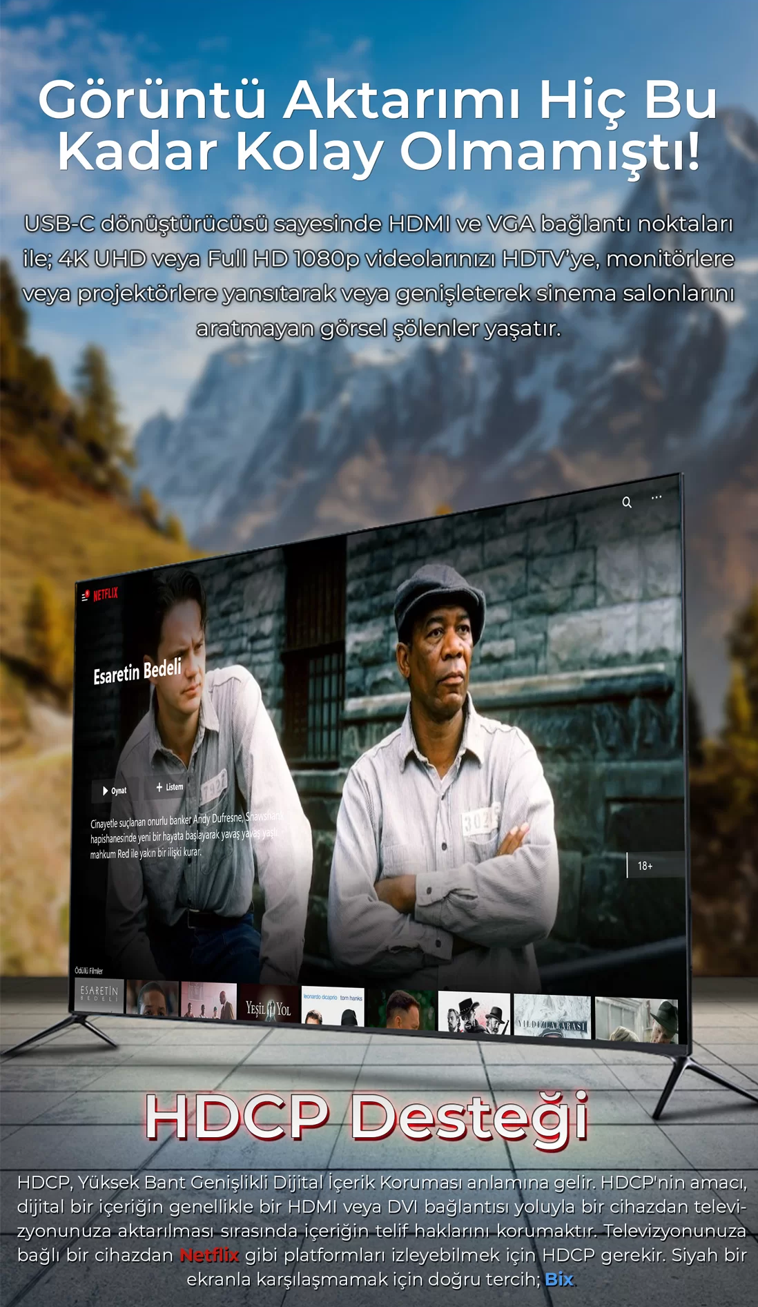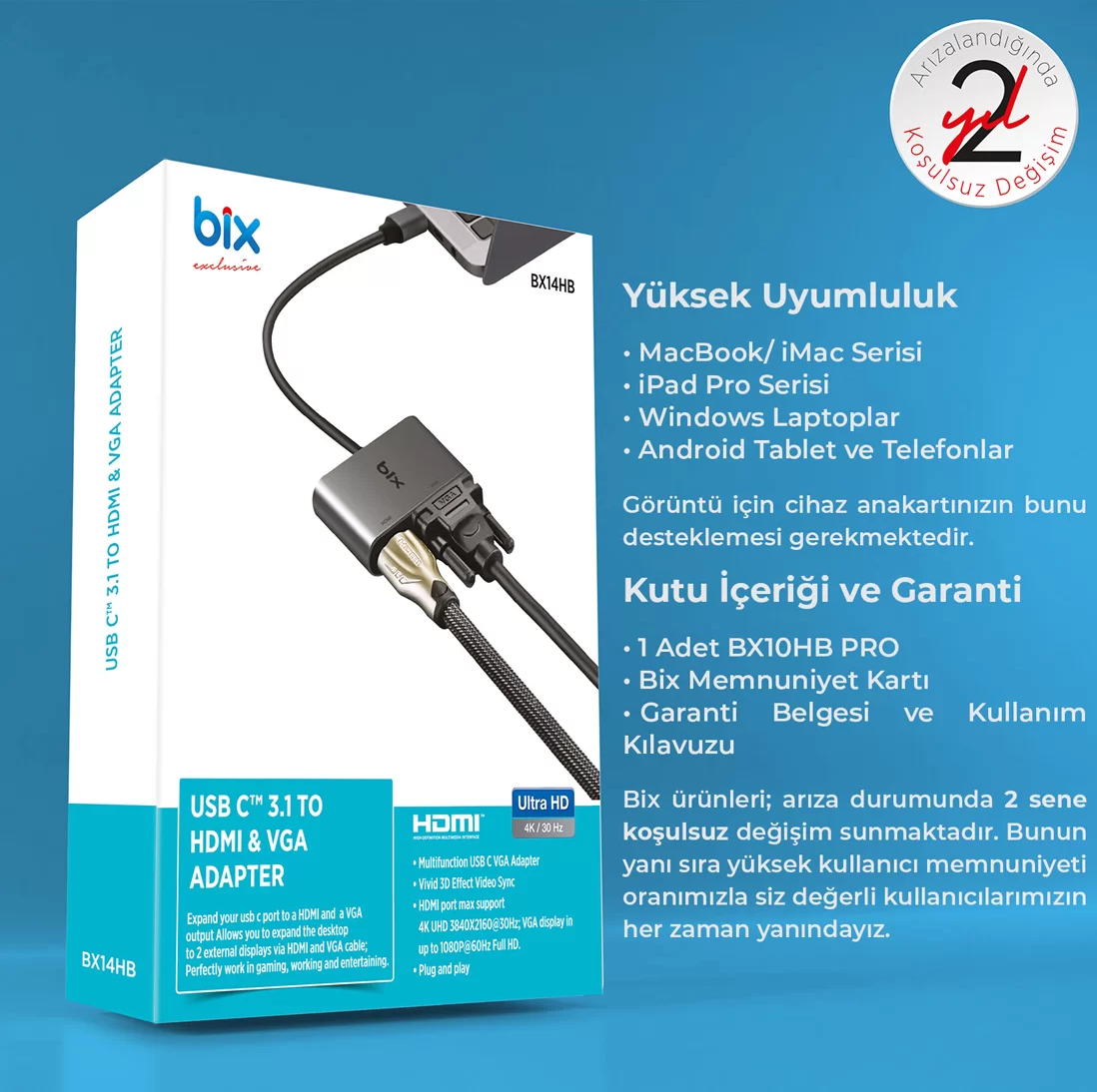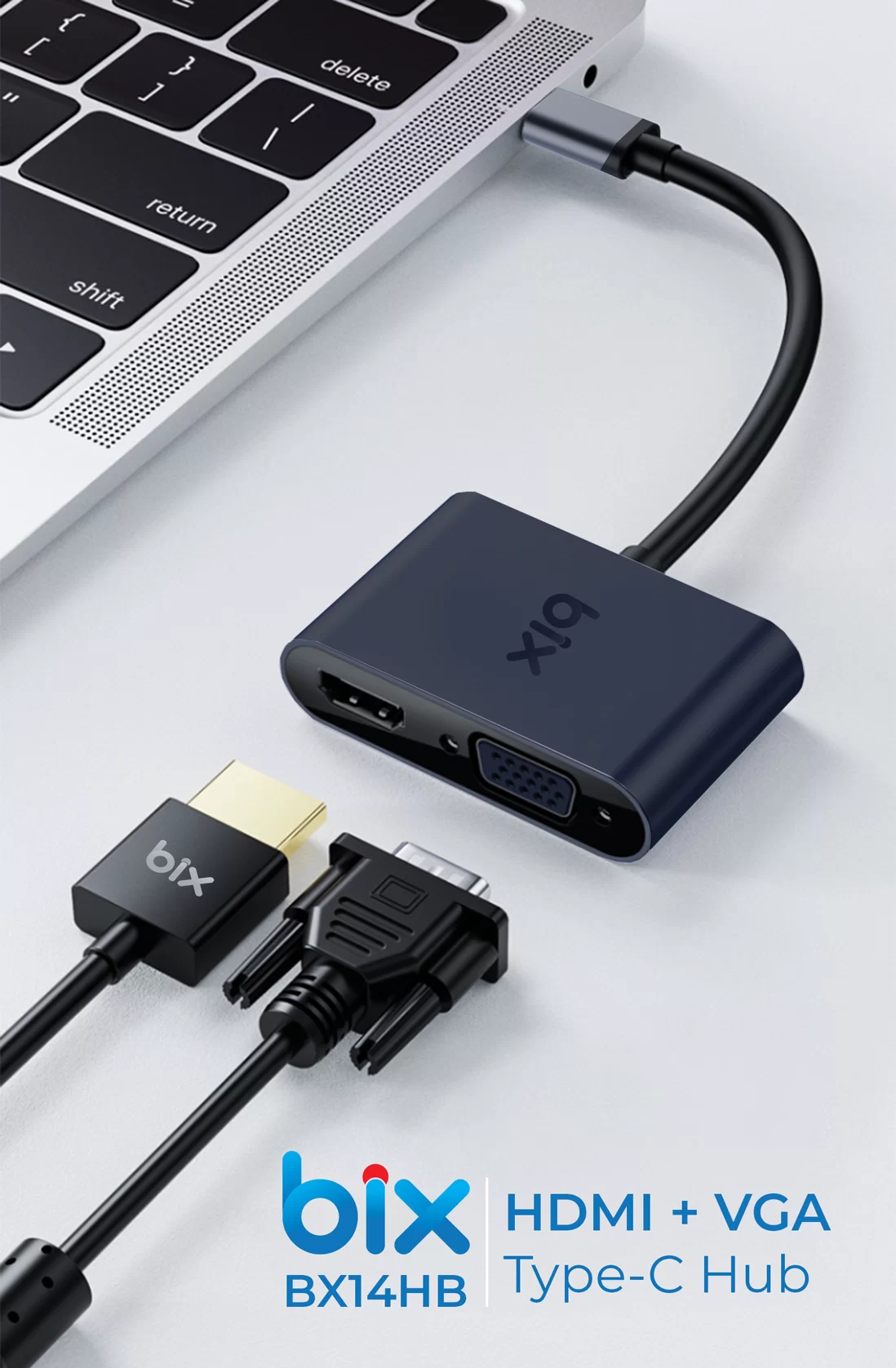 Bix BX14HB USB-C 3.1 HDMI & VGA dönüştürücü adaptör ile Type-C portuna sahip olan cihazlarınızı HDMI ve VGA portu üzerinden UHD 2K/4K, 1080P çözünürlüklerde televizyon ve monitörlere bağlayabilirsiniz.