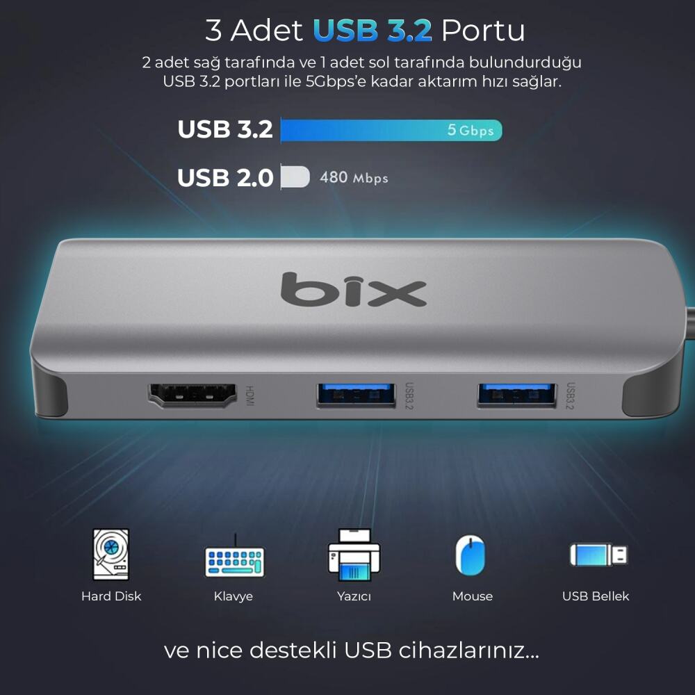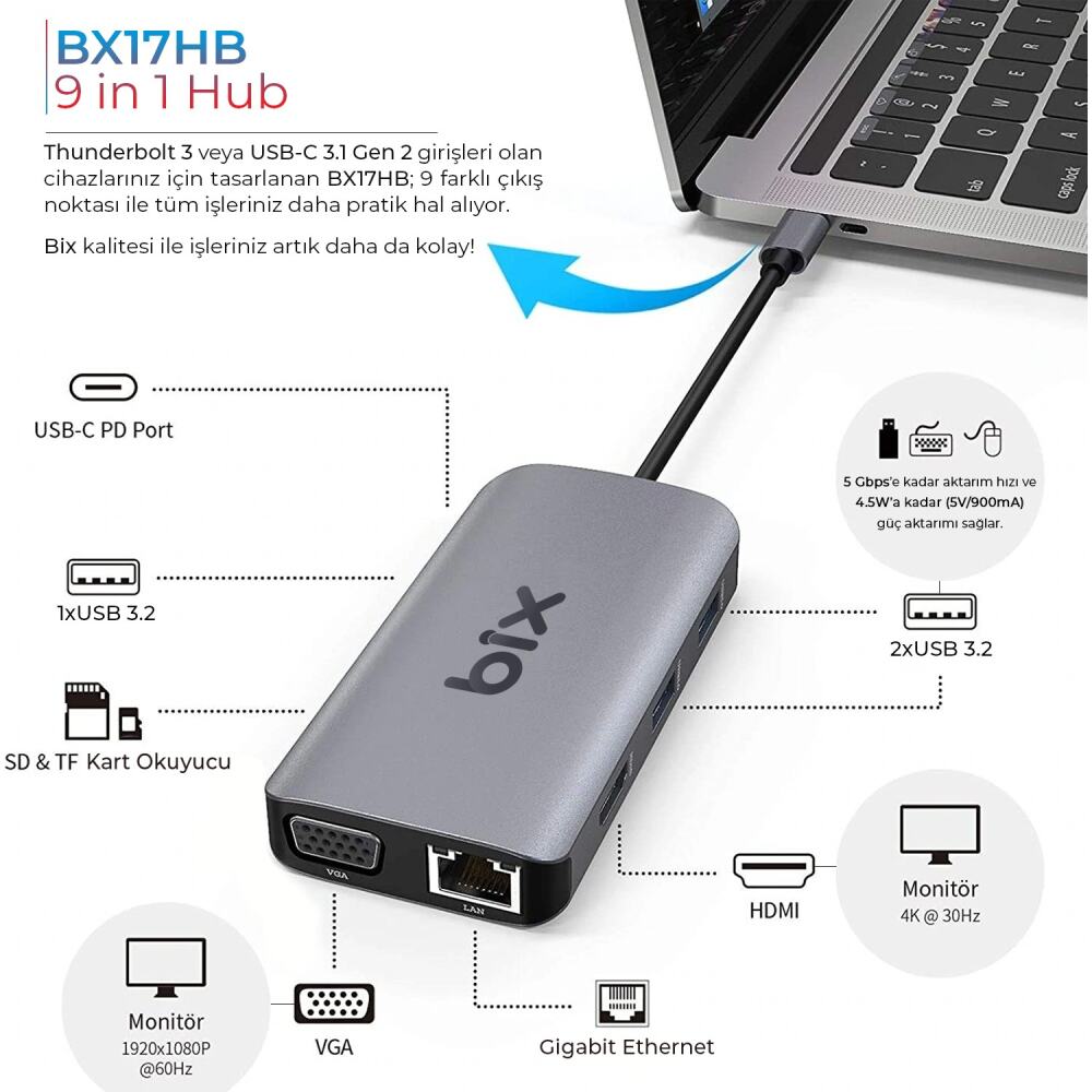 Bix BX17HB Type-C to Gigabit Ethernet HDMI PD USB 3.2 Micro SD/SD VGA Çoklayıcı Adaptör, Thunderbolt 3 veya Type-C 3.1 girişleri olan cihazlarınız için tasarlanmış olup 9 farklı çıkış noktası ile tüm işlerinizi daha da pratik hale getirmektedir. Ürün üzerinde 3 adet USB 3.2 port, 1 adet HDMI, 1 adet Gigabit Ethernet, 1 adet PD Şarj, 1 adet Micro SD, 1 Adet SD ve 1 Adet VGA Portu bulunmaktadır. PD 3.0 / 100W şarj çıkışı ile cihazlarınızın ihtiyacı olan gücü tek başına sağlar. WiFi’dan daha kararlı ve daha güvenli internet deneyiminin yanı sıra 100/100/1000Mbps desteği ile hızlı ethernet performans sunar. 3 port USB; klavye, mouse, flash bellek vb. cihazları Type-C cihazınıza bağlamanızı sağlar. Apple Cihazlarla uyumludur.